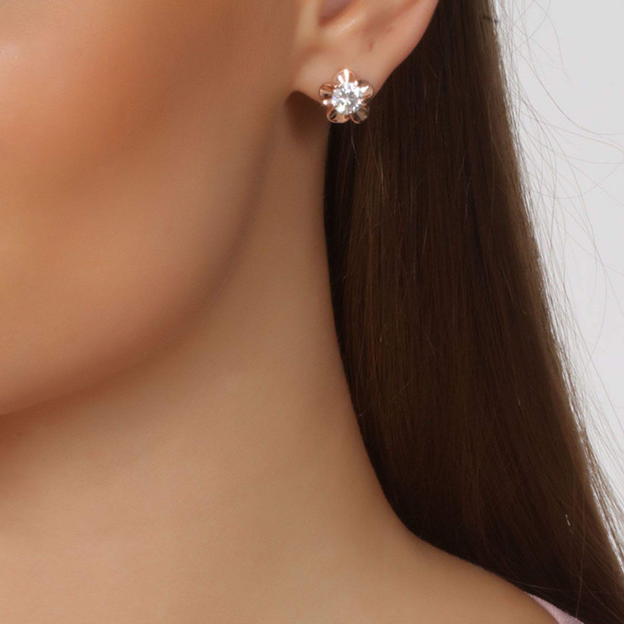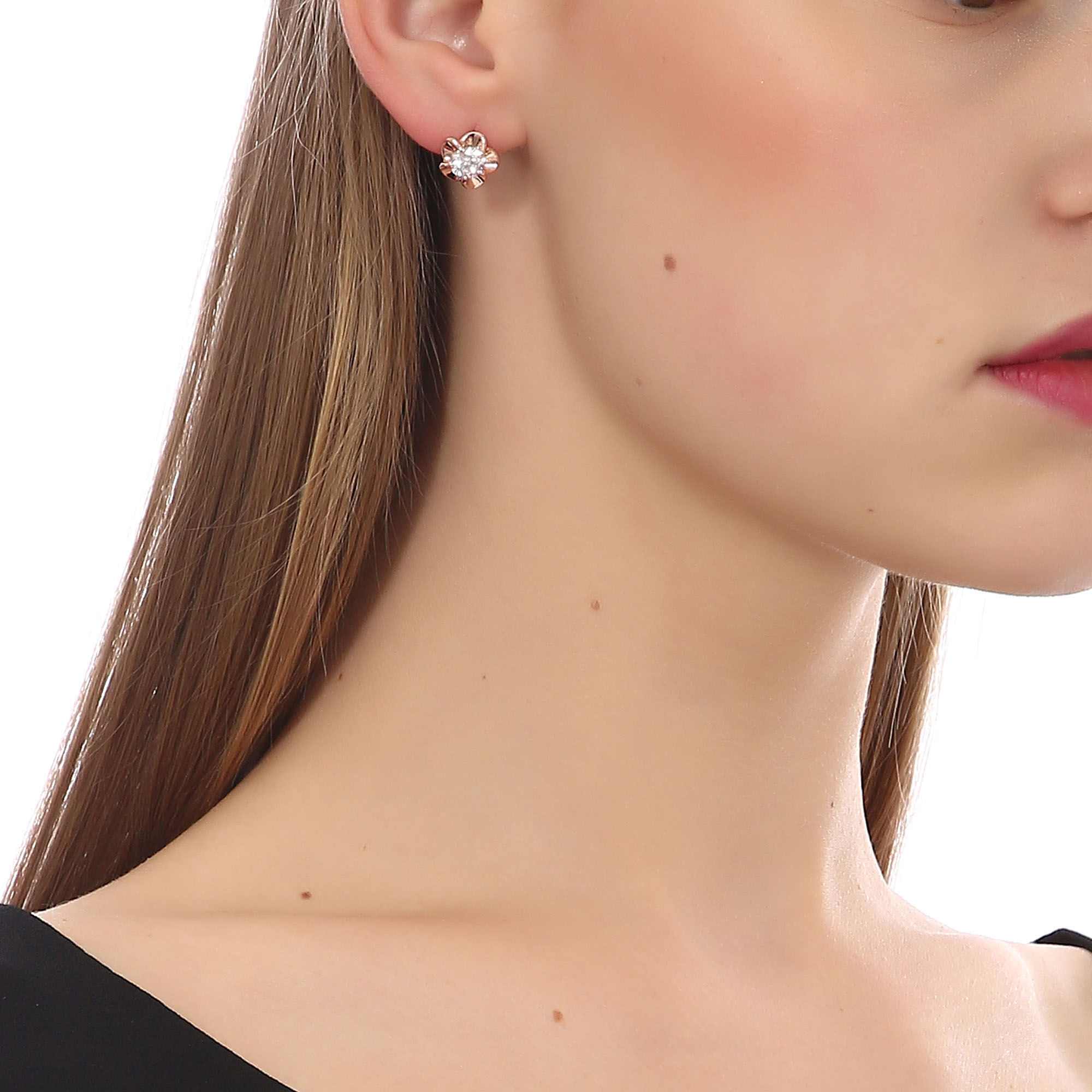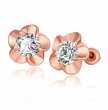 Aretes en baño de oro rosa de 18 quilates, diseño de flor, con incrustación de cristal en color blanco corte brillante. Fabricado en una estructura de aleación de platino con rodio sin níquel.