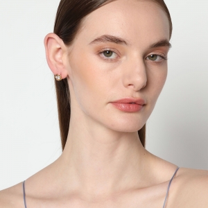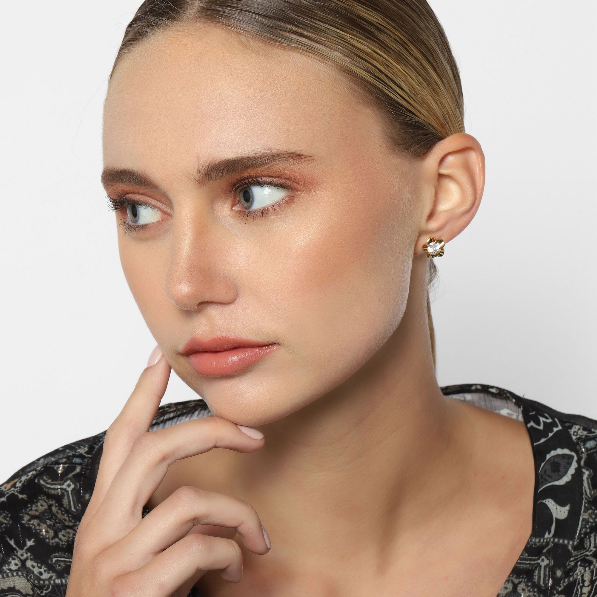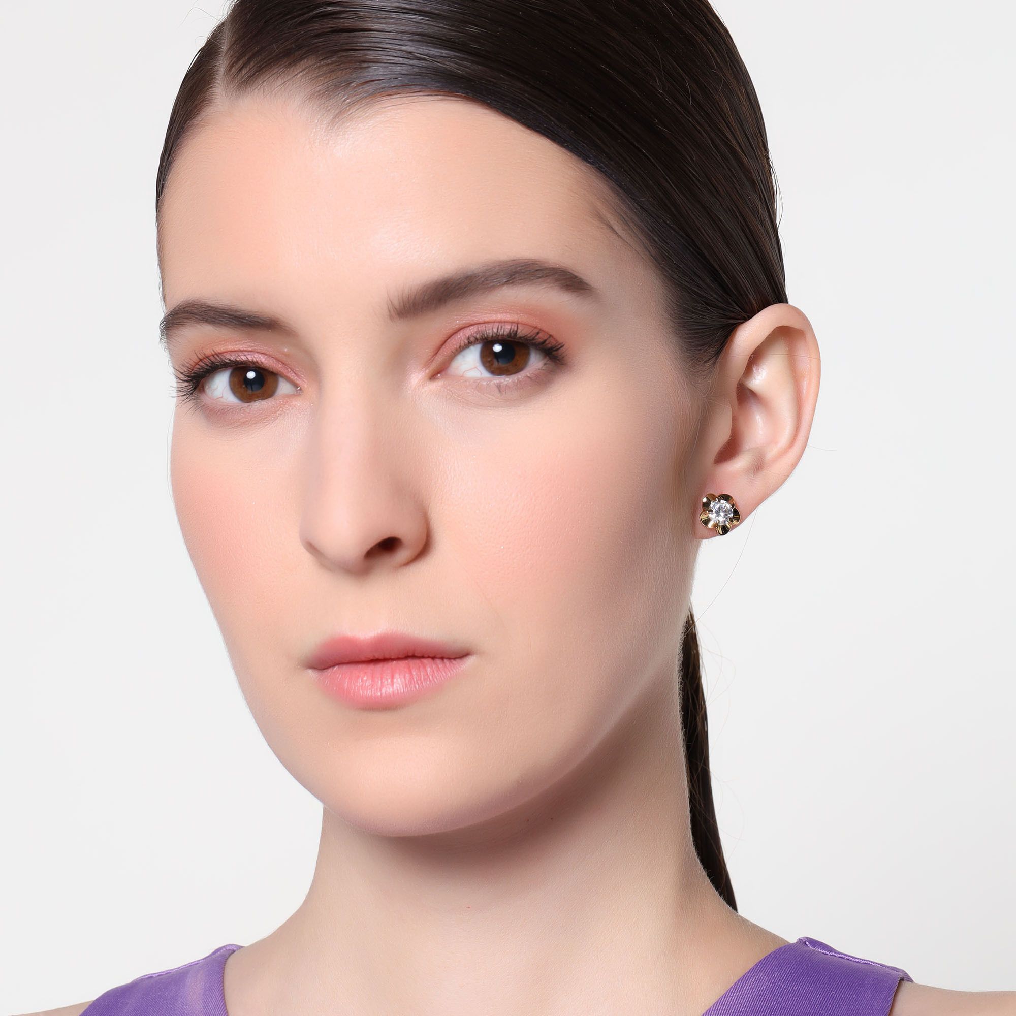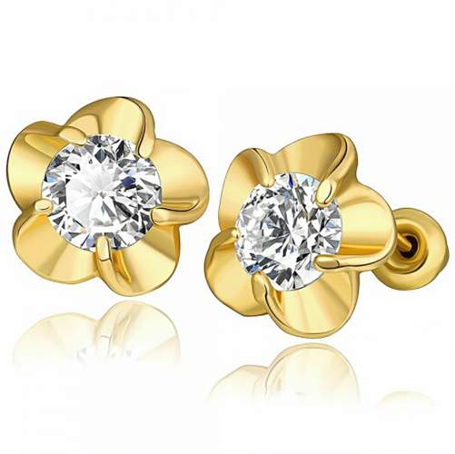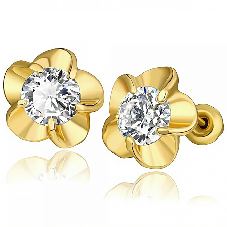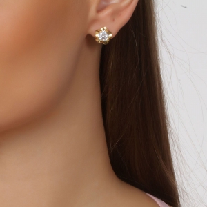 Aretes en baño de oro amarillo de 18 quilates, diseño de flor, con incrustación de cristal en color blanco corte brillante.