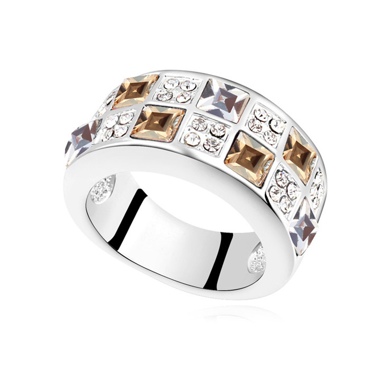 Anillo en baño de oro blanco de 18 quilates, diseño de cuadros con incrustaciones de cristales en color ámbar y blanco.