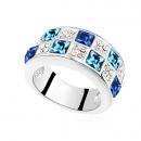 Anillo en baño de oro blanco de 18 quilates, diseño de cuadros, con incrustaciones de cristales en tonos azules y blanco.