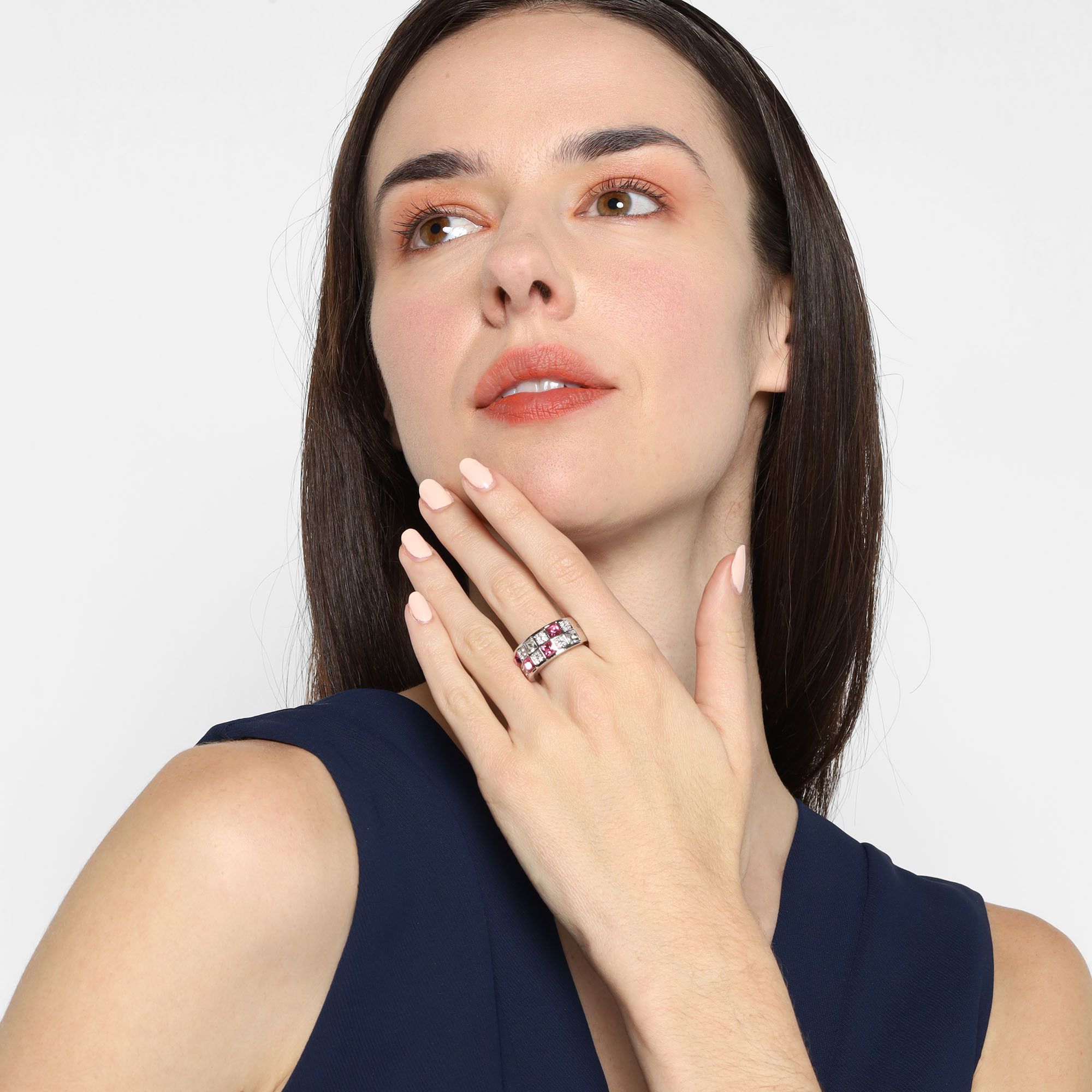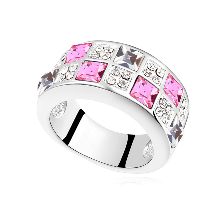 Anillo en baño de oro blanco de 18 quilates, diseño de cuadros, con incrustaciones de cristales en color blanco y rosa.