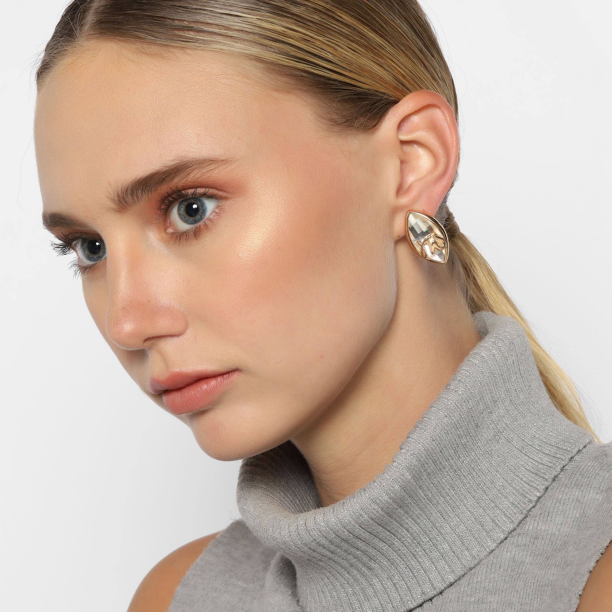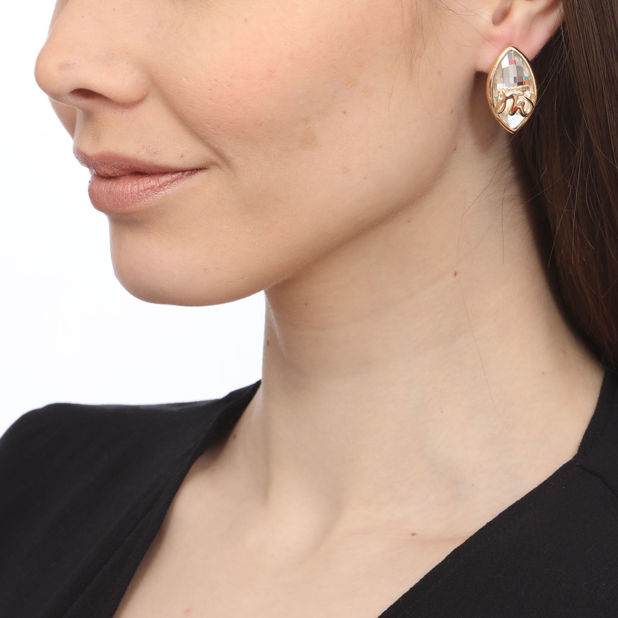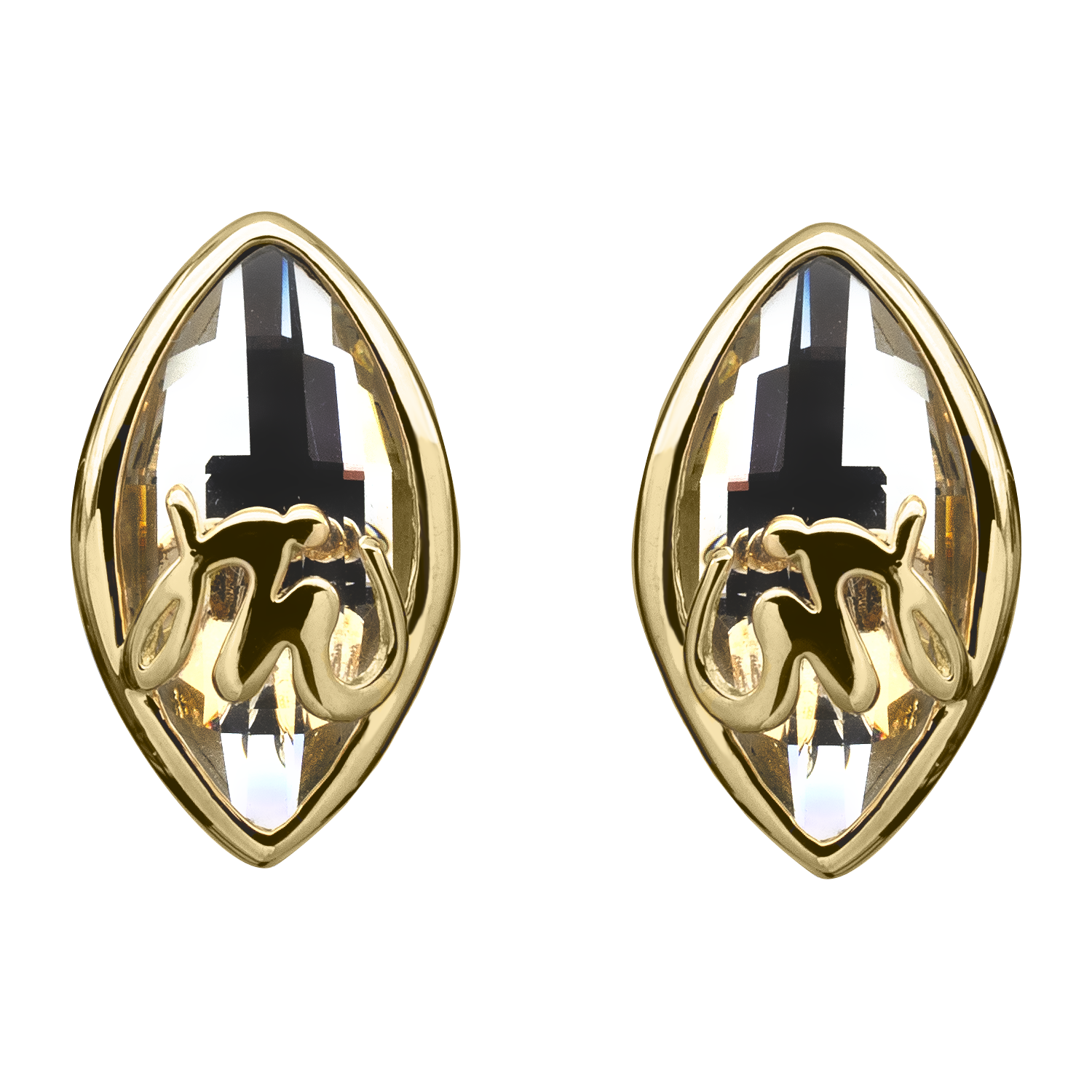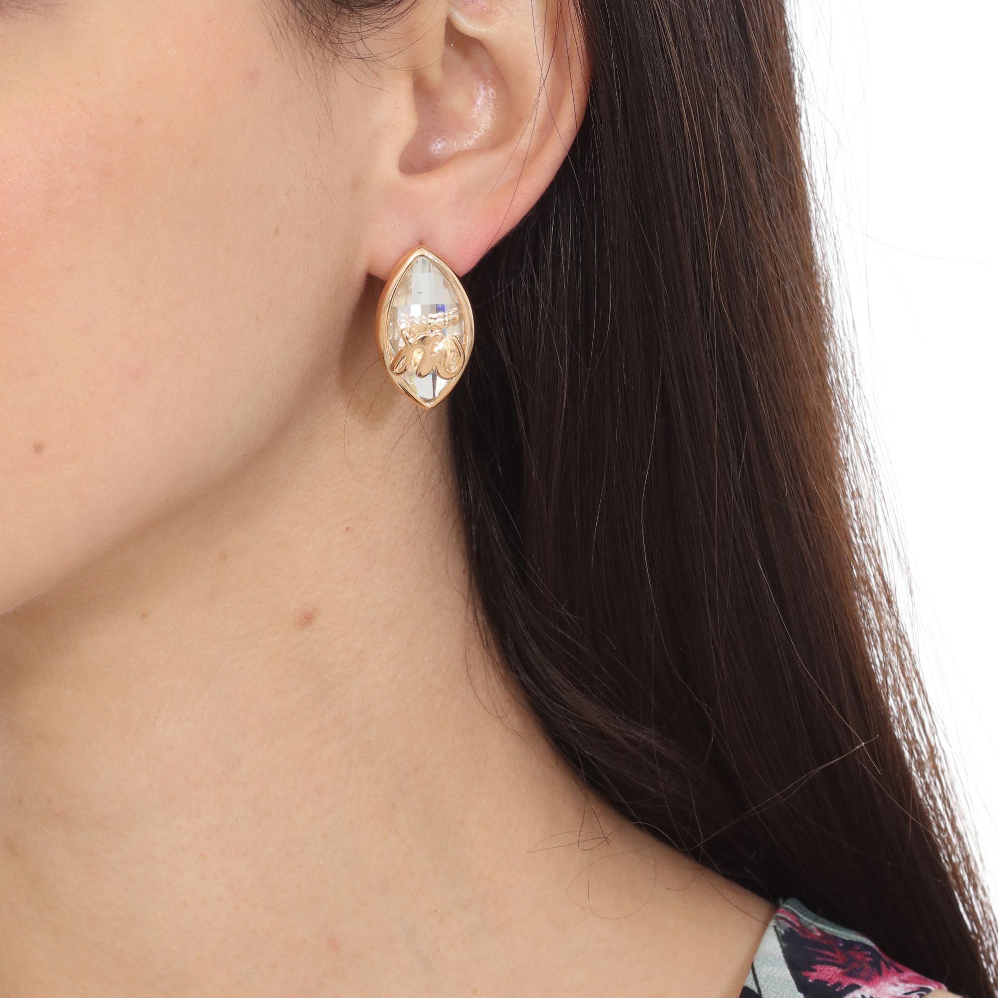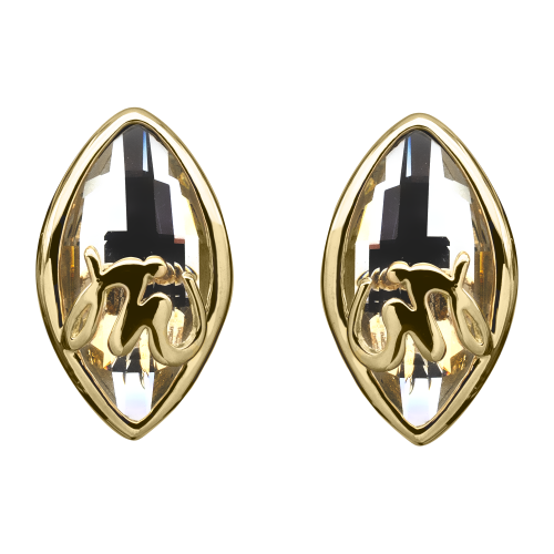 Preciosos aretes, en baño de oro amarillo de 18 quilates, exquisito diseño, con cristal blanco corte marquesa y detalles en relieve.