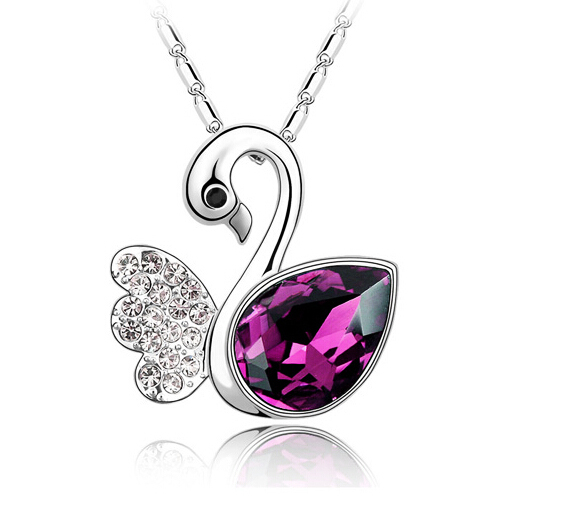 Dije con cadena en baño de oro blanco de 18 quilates, Hermoso diseño de cisne con detalle de cristal en color morado e incrustación de cristales en color blanco. Fabricado en una estructura de aleación de platino con rodio sin níquel 1. joyería Hipoalergénica. 2. Incluye cajita de joyería. 3. Garantía de 30 días por defectos de fabrica.