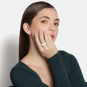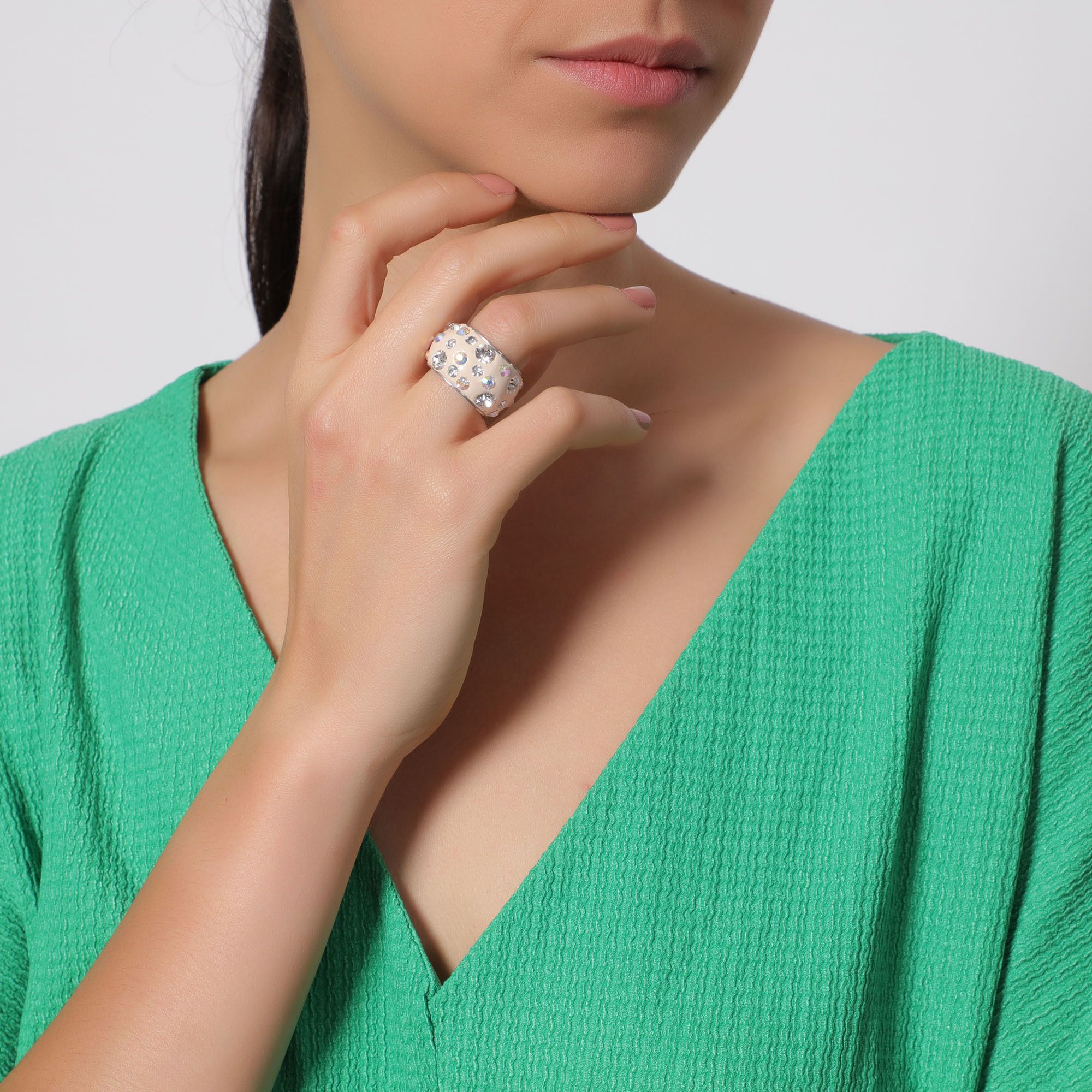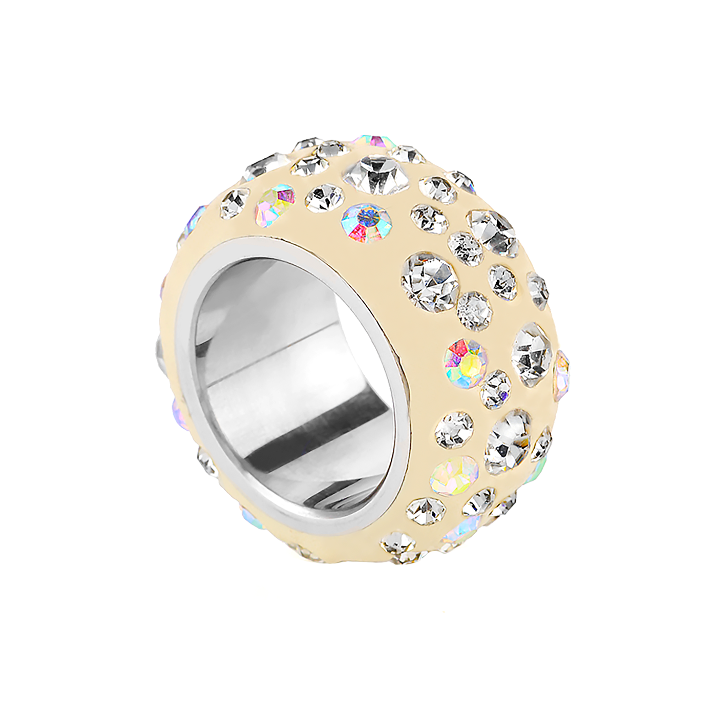 Anillo en acero inoxidable, elegante diseño, con fondo beige e incrustaciones de cristales en color blanco y tornasol.
