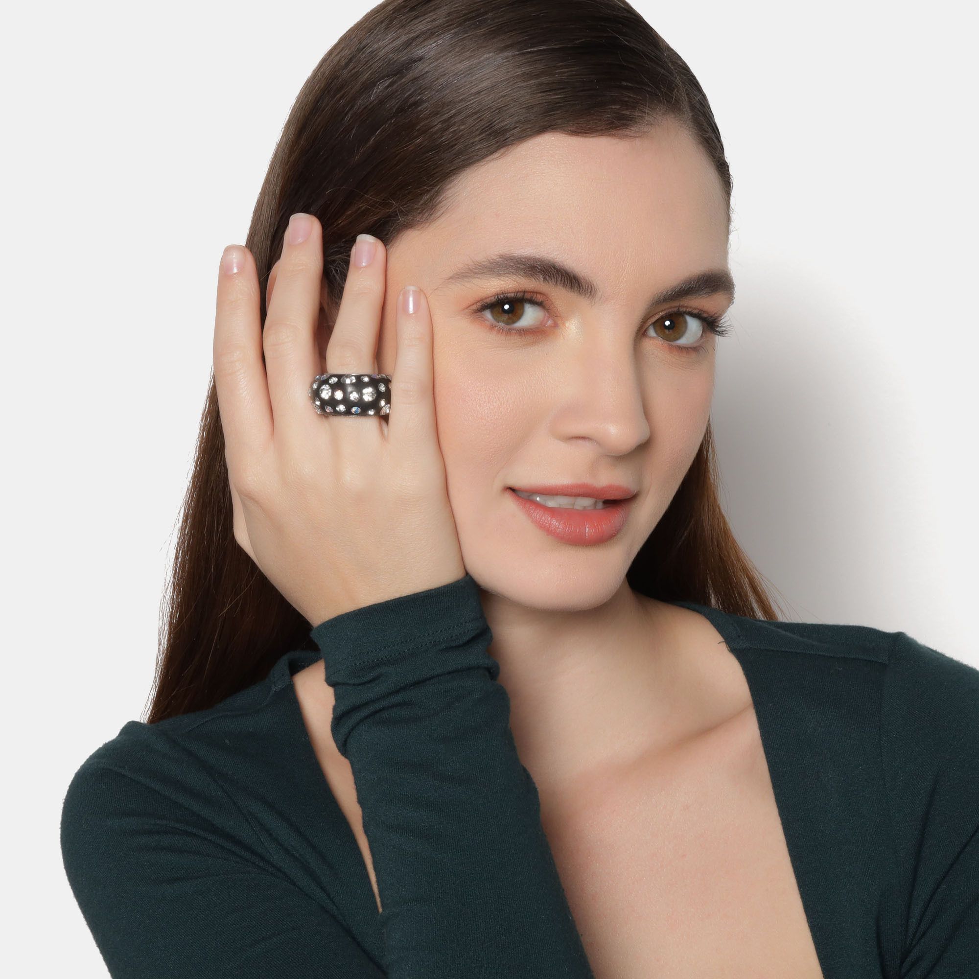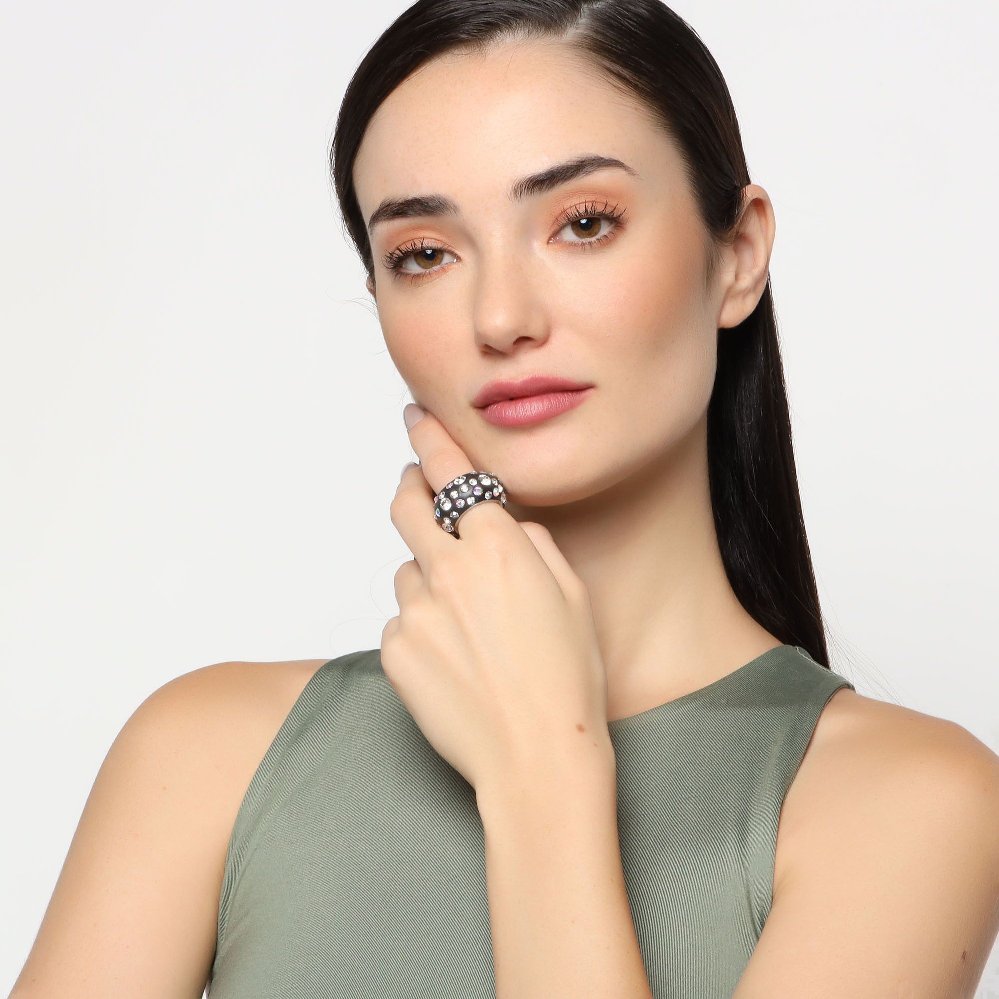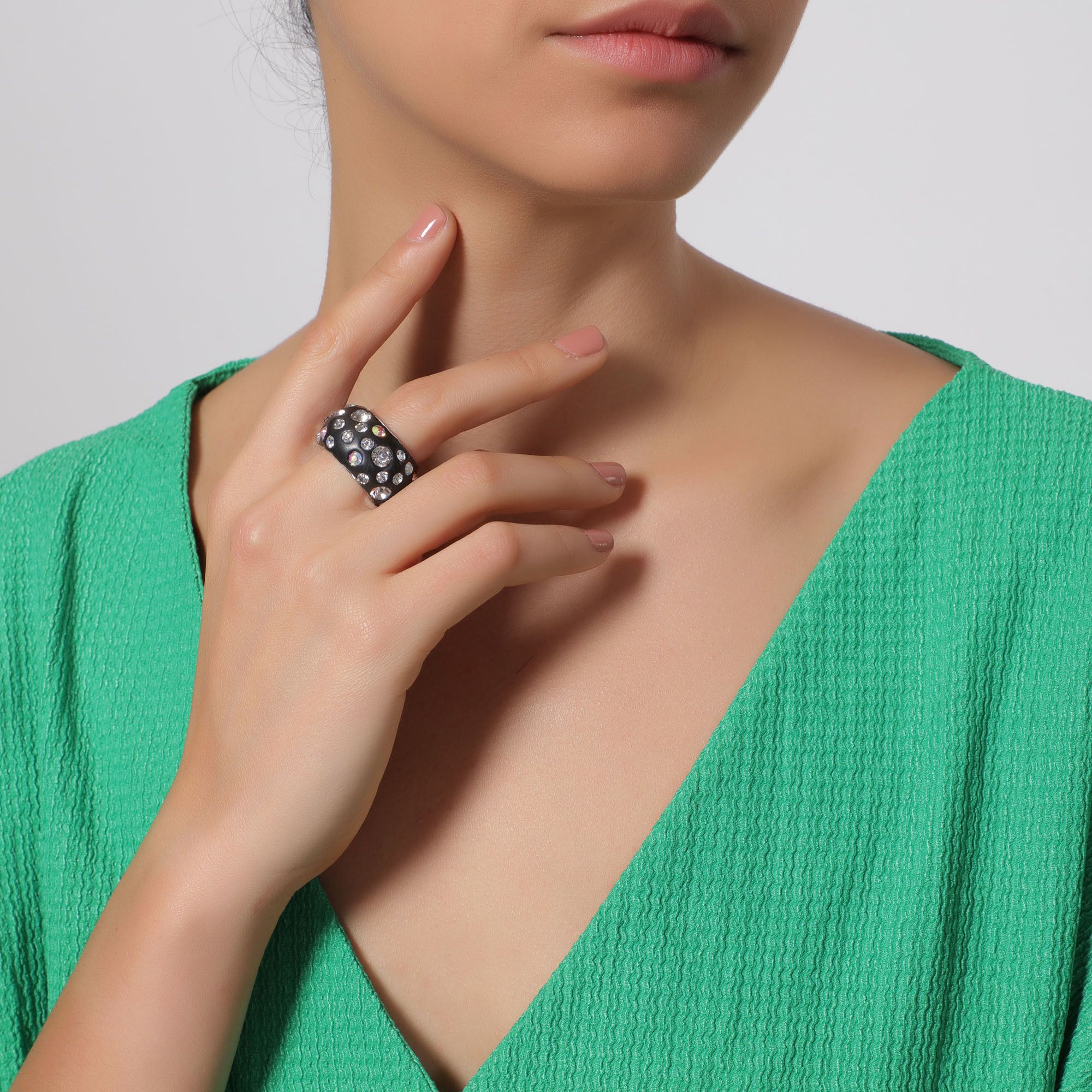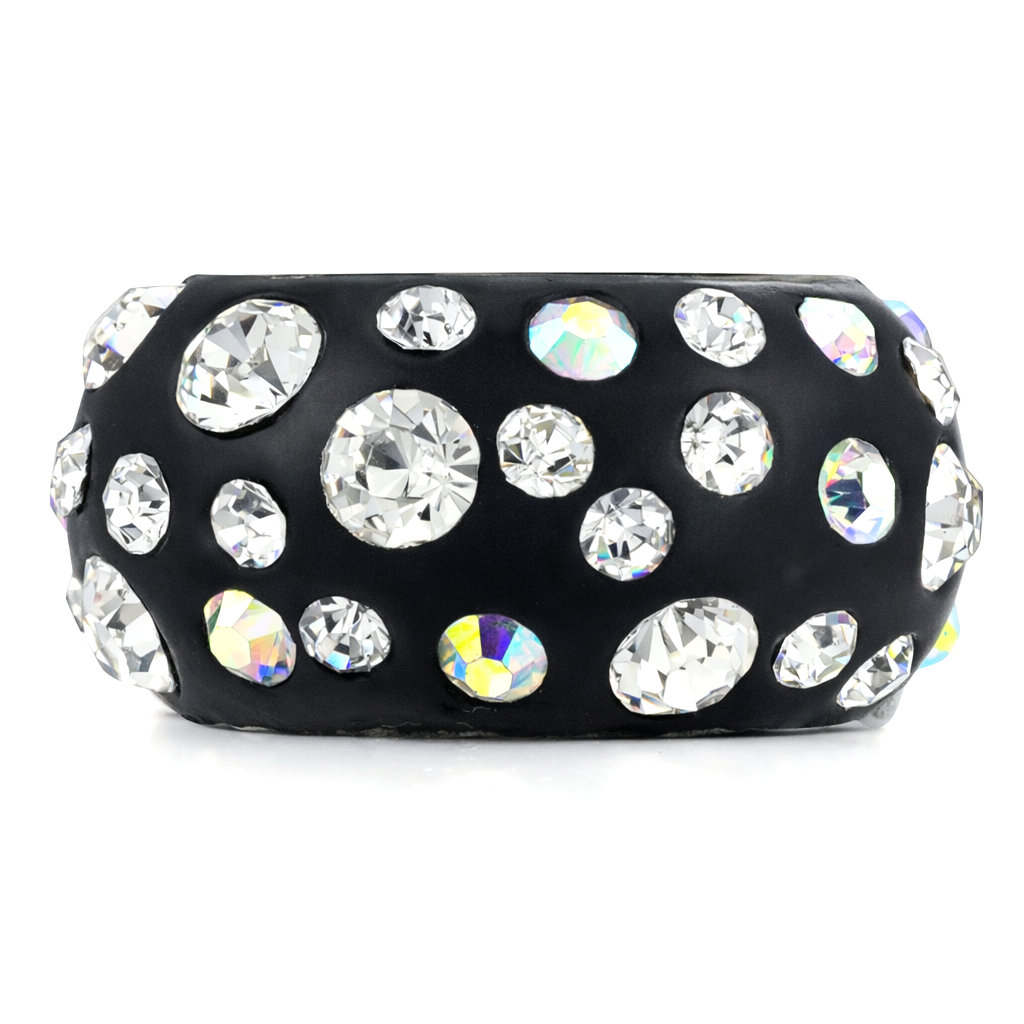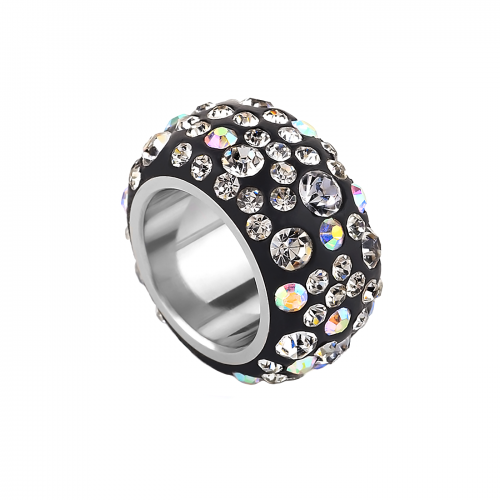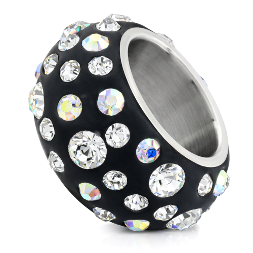Anillo en acero inoxidable, elegante diseño, con fondo color negro e incrustaciones de cristales en color blanco y tornasol.