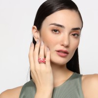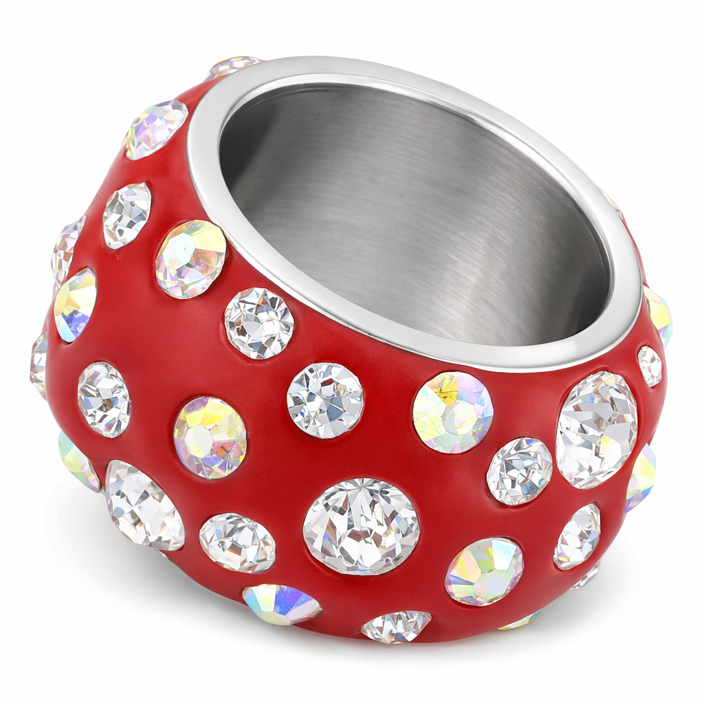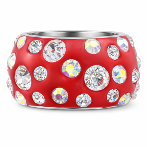 Anillo en acero inoxidable, elegante diseño, con fondo color coral e incrustaciones de cristales en color blanco y tornasol.
