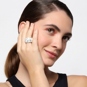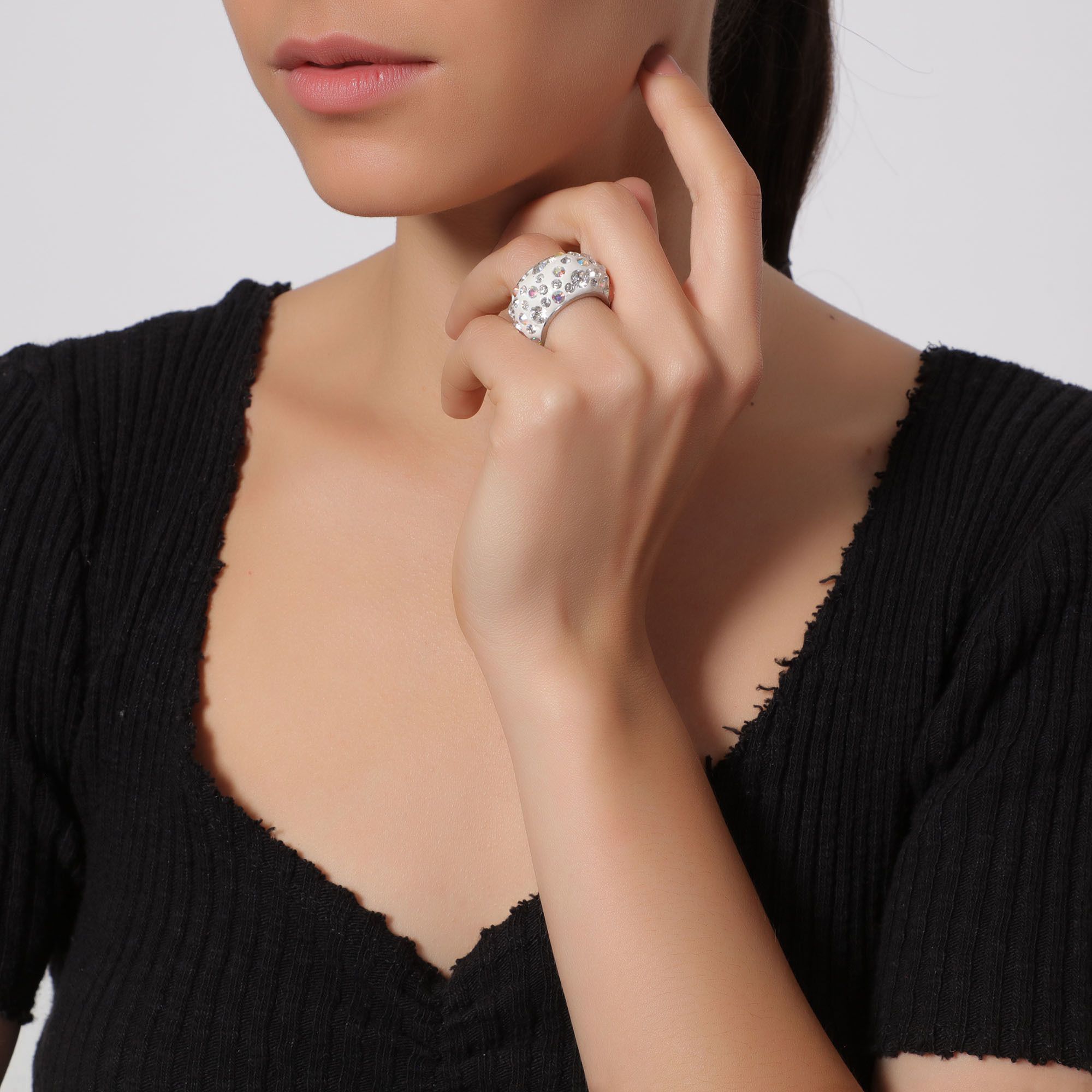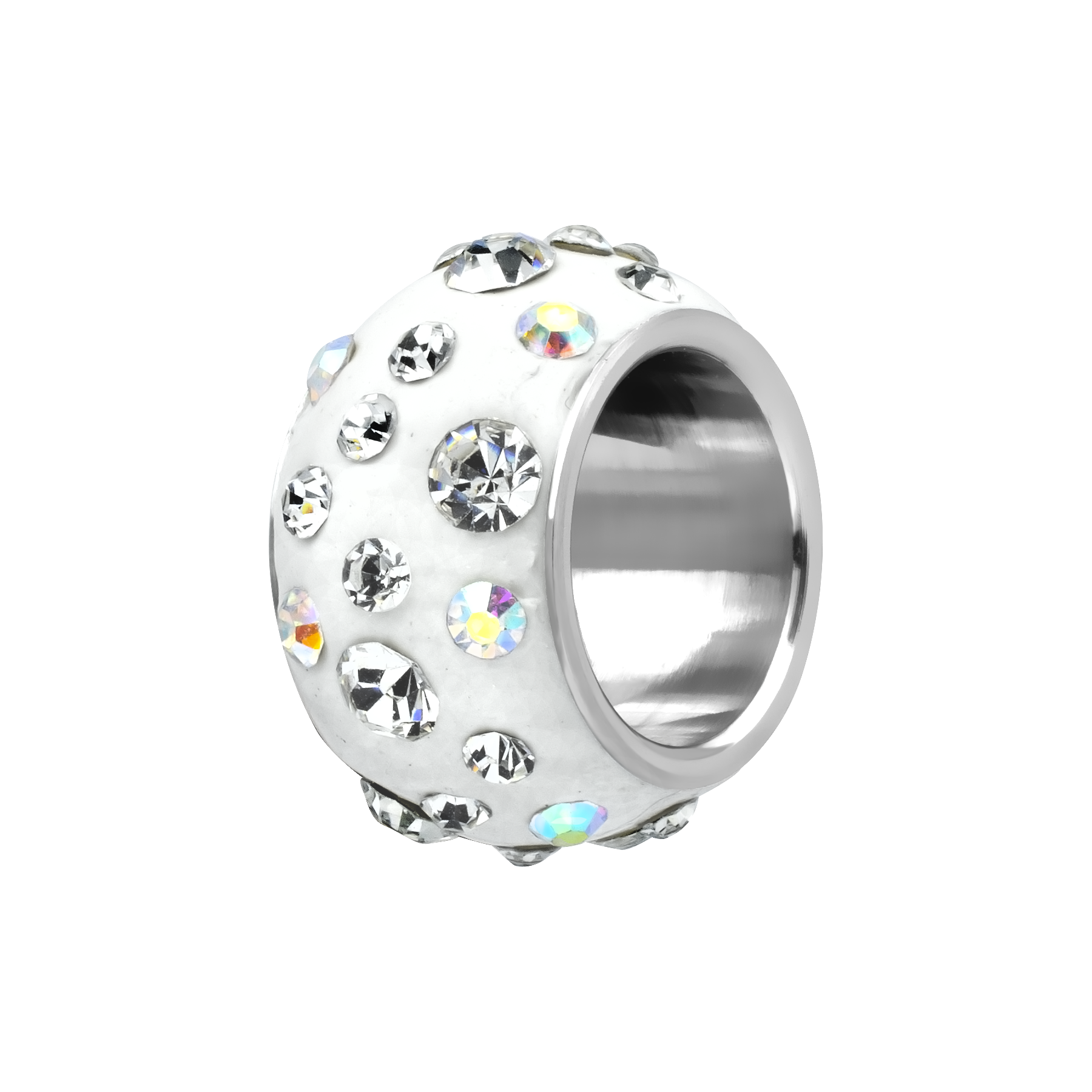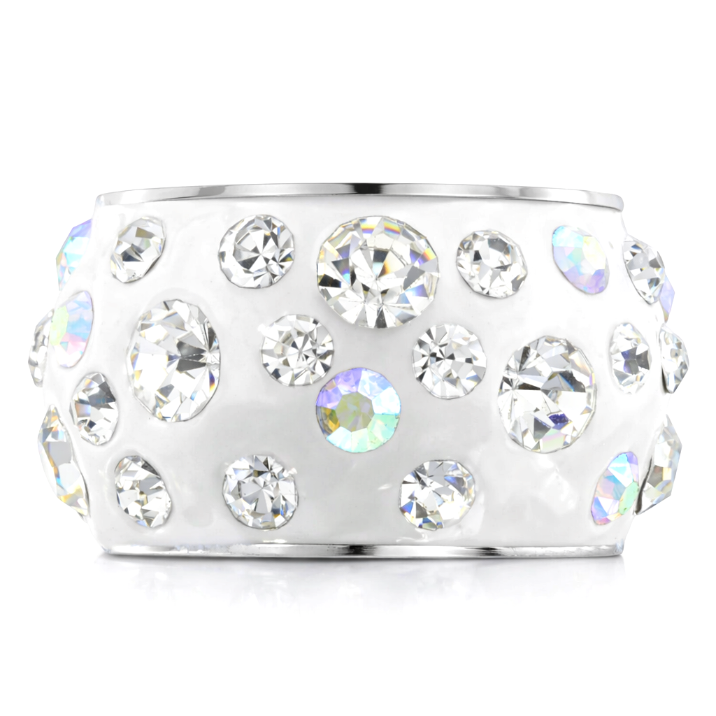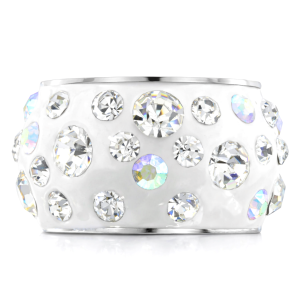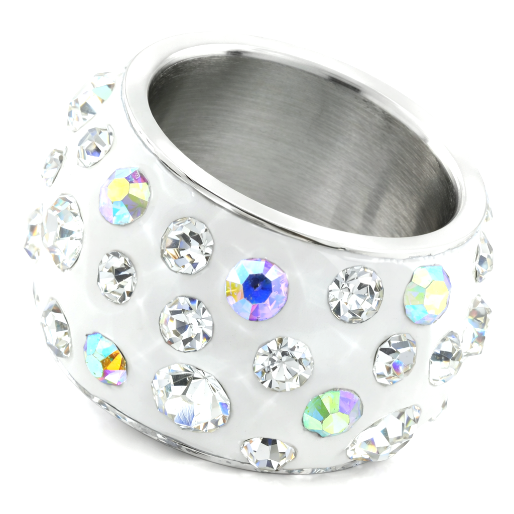 Anillo en acero inoxidable, elegante diseño, con fondo blanco e incrustaciones de cristales blanco y tornasol.