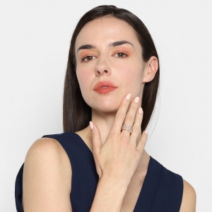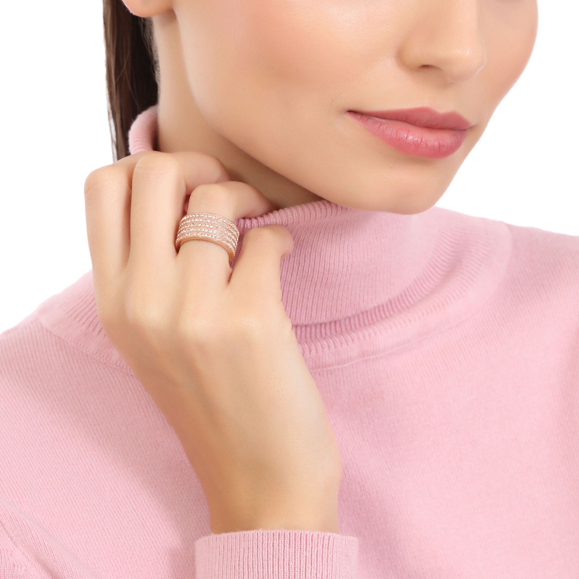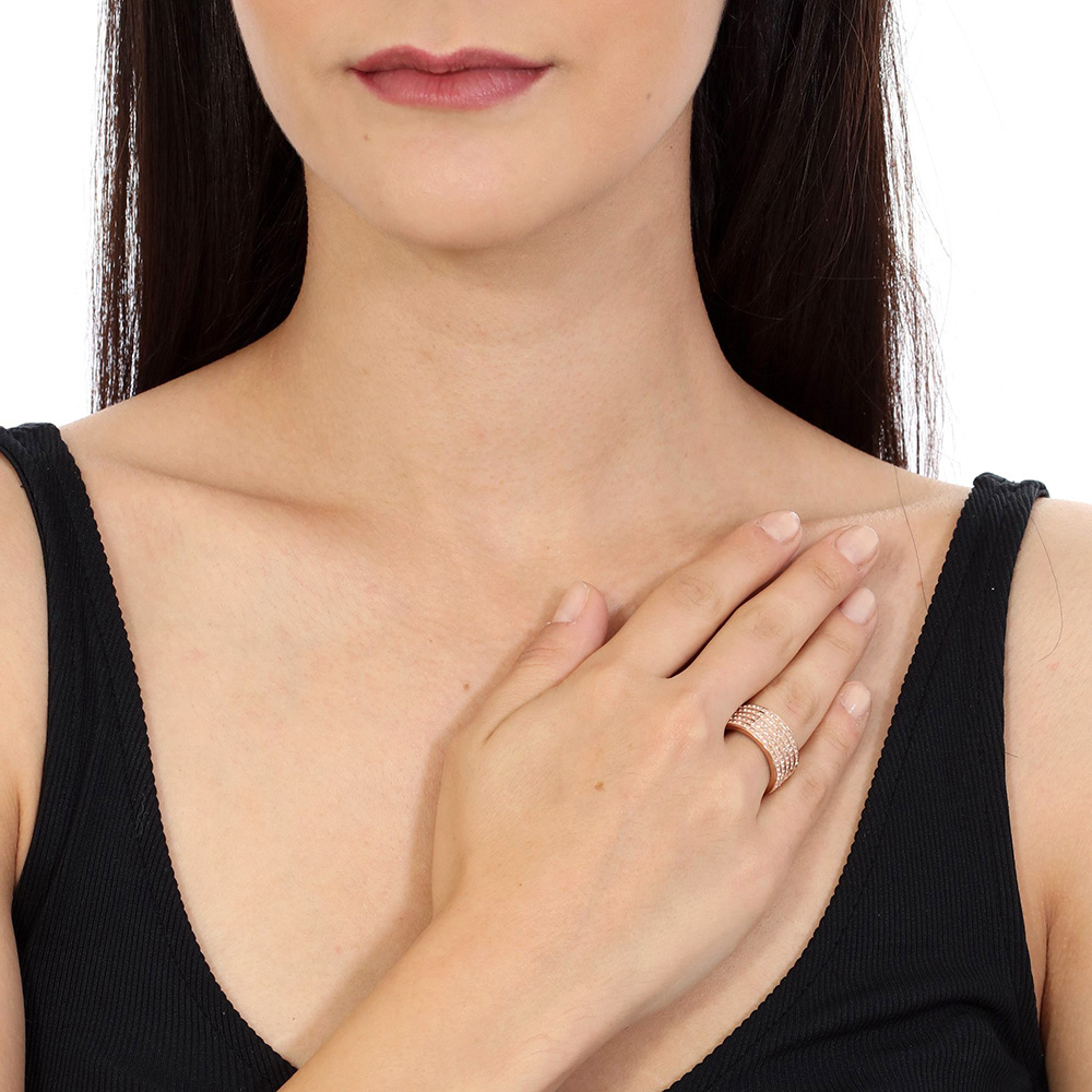 Lindo anillo, de acero inoxidable en acabado rosado, original diseño, estilo multiaro, con incrustaciones de cristales en color ámbar.