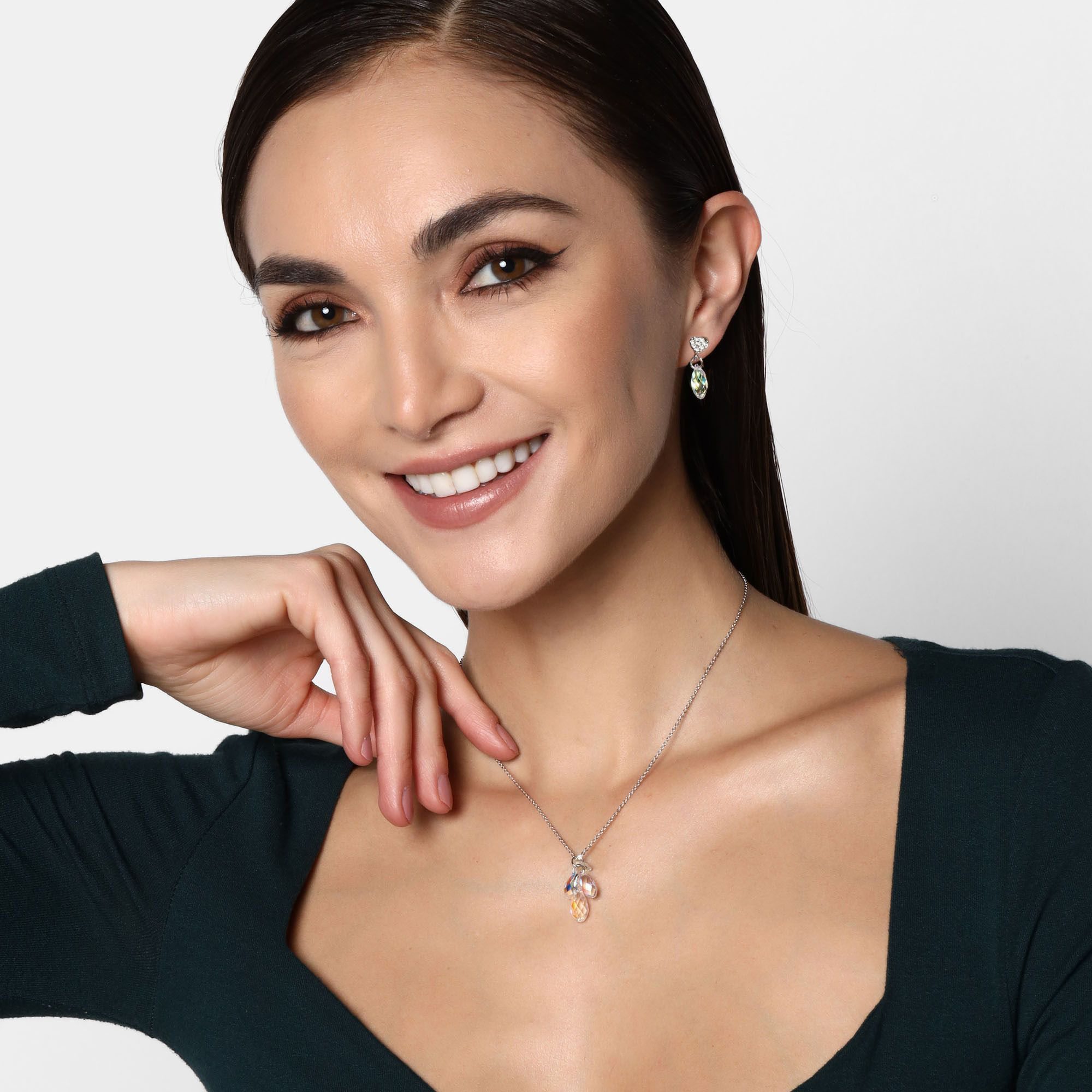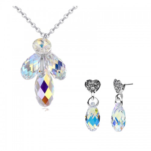 Elegante set de aretes y dije con cadena en baño de oro blanco de 18 quilates, diseño de gota y corazón con cristales tornasol corte briollette e incrustaciones de cristales blancos.