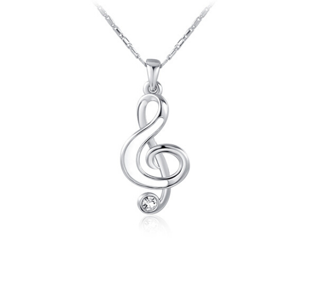 Lindo Dije en baño de oro blanco de 18 quilates, diseño de nota musical con detalle de concha nacar e incrustación de cristal en color blanco. Fabricado en una estructura de aleación de platino con rodio sin níquel 1. joyería Hipoalergénica. 2. Incluye cajita de joyería. 3. Garantía de 30 días por defectos de fabrica.