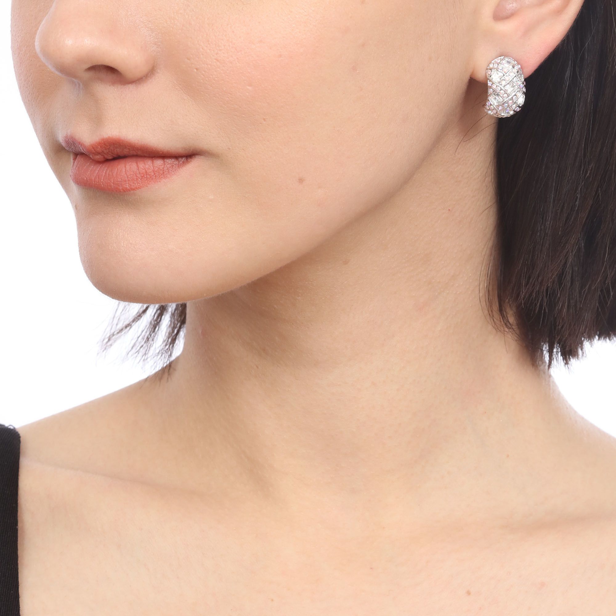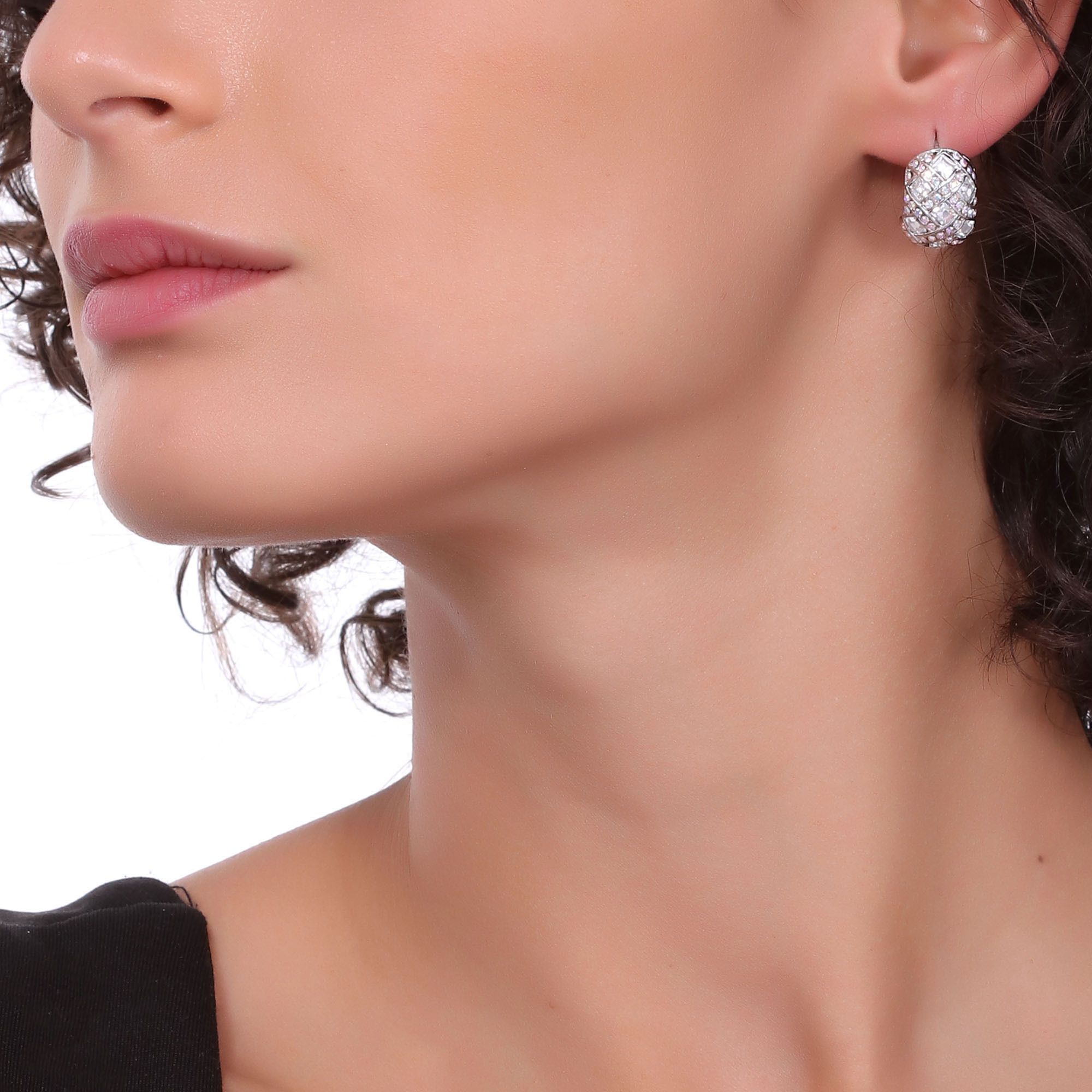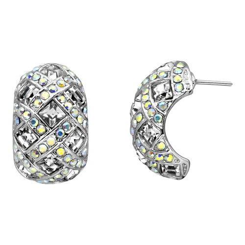 Arracadas en baño de oro blanco de 18 quilates, diseño trenzado, con incrustaciones de cristales en color blanco y tornasol.