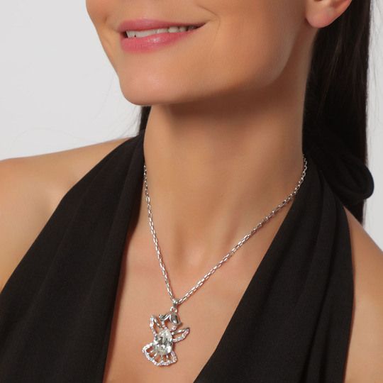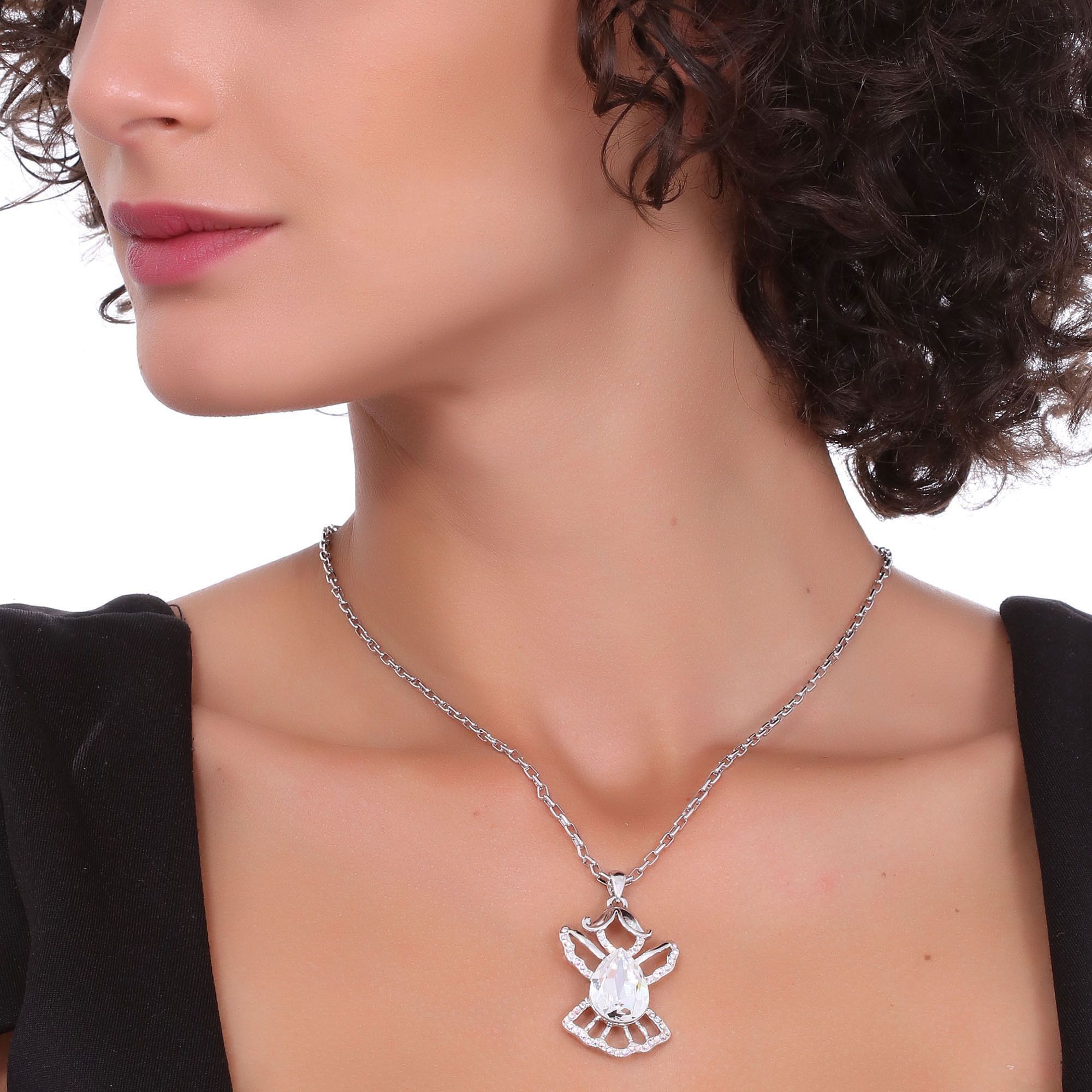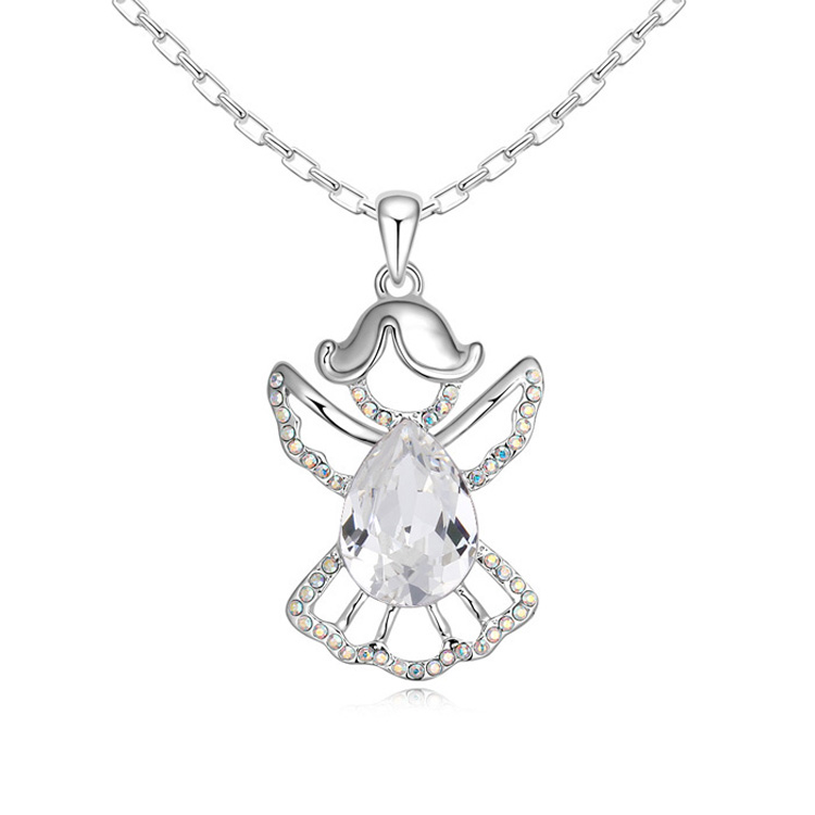 Dije en baño de oro blanco de 18 quilates, diseño de angel con incrustación de cristales en color blanco y tornasol. Cuenta con una cadena de 40 cm, con extención de 5 cm. Fabricado en una estructura de aleación de platino con rodio sin níquel. 1. joyería Hipoalergénica. 2. Incluye cajita de joyería. 3. Garantía de 30 días por defectos de fabrica.