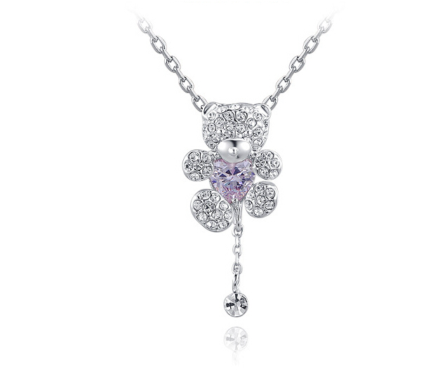 Dije con cadena en baño de oro blanco de 18 quilates, diseño de oso con incrustación de cristales en color blanco y lila. Fabricado en una estructura de aleación de platino con rodio sin níquel 1. joyería Hipoalergénica. 2. Incluye cajita de joyería. 3. Garantía de 30 días por defectos de fabrica.