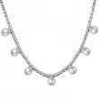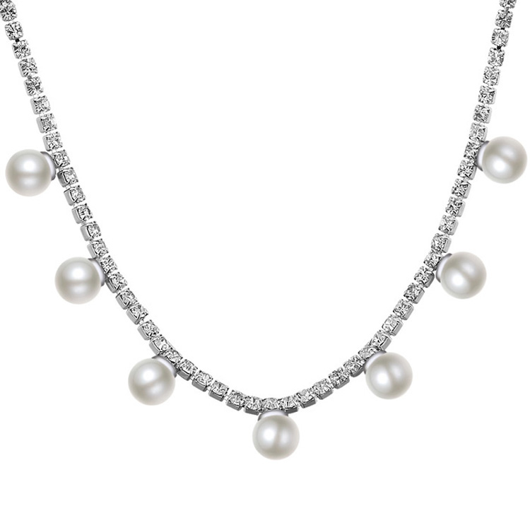 Lindo Collar en baño de oro blanco de 18 quilates con incrustación de cristales en toda la cadena en color blanco y detalles de perlas blancas. Fabricado en una estructura de aleación de platino con rodio sin níquel. 1. joyería Hipoalergénica. 2. Incluye cajita de joyería. 3. Garantía de 30 días por defectos de fabrica.