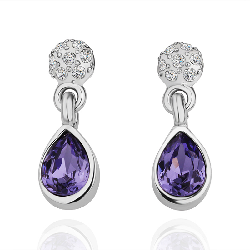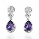 Aretes en baño de oro blanco de 18 quilates, diseño de gota, con cristal morado corte pera e incrustación de cristales blancos.