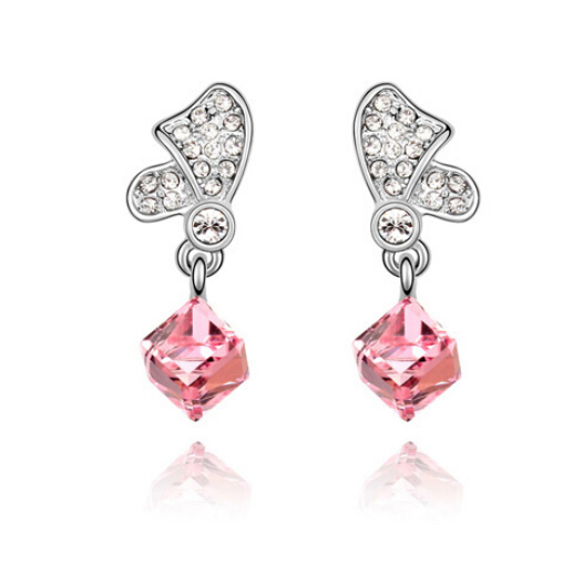 Preciosos aretes, en baño de oro blanco de 18 quilates, elegante diseño, estilo alas de mariposa y cubo de cristal color rosa. Fabricado en una estructura de aleación de platino con rodio sin níquel.
