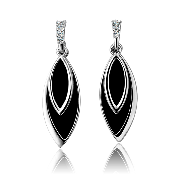 Aretes en baño de oro blanco de 18 quilates, elegante diseño de hojas, con esmaltado color negro e incrustación de cristales en color blanco. Fabricado en una estructura de aleación de platino con rodio sin níquel.