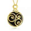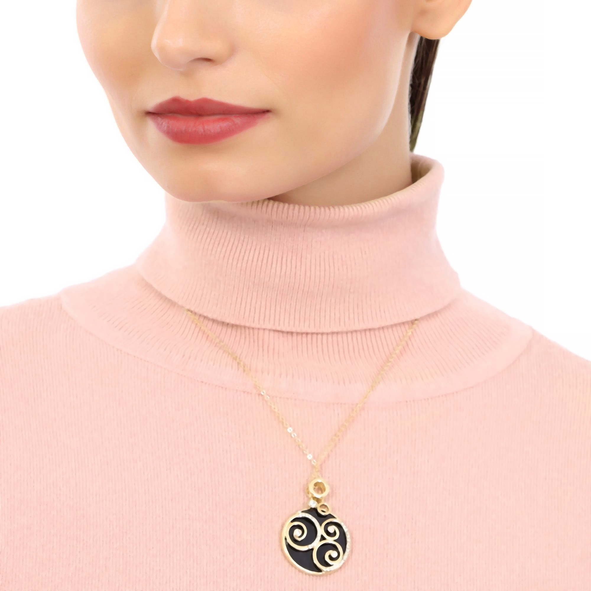 Dije en baño de oro amarillo de 18 quilates, diseño de círculo con detalles de filigrana e incrustación de cristales en color blanco.