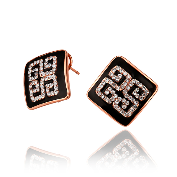 Aretes en baño de oro rosa de 18 quilates, diseño cuadrado, esmaltado color negro y detalle de grecas con incrustaciones de cristales blancos.