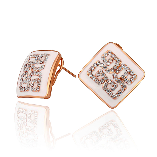 Aretes en baño de oro rosa de 18 quilates, diseño cuadrado, esmaltado color blanco y detalle de grecas con incrustaciones de cristales blancos. Fabricado en una estructura de aleación de platino con rodio sin níquel