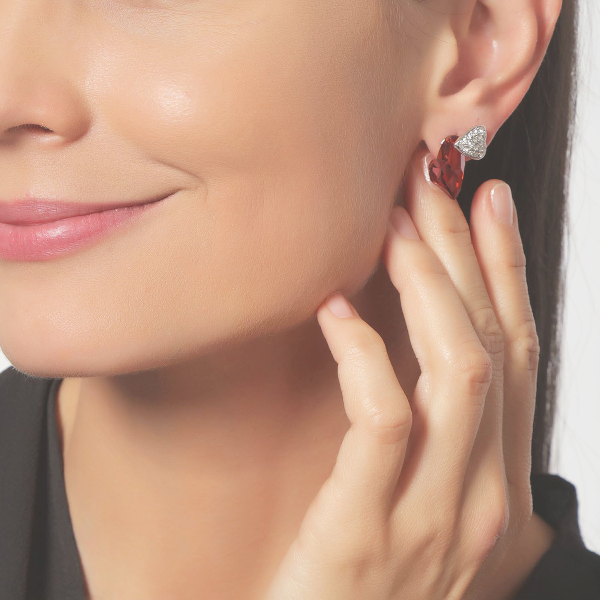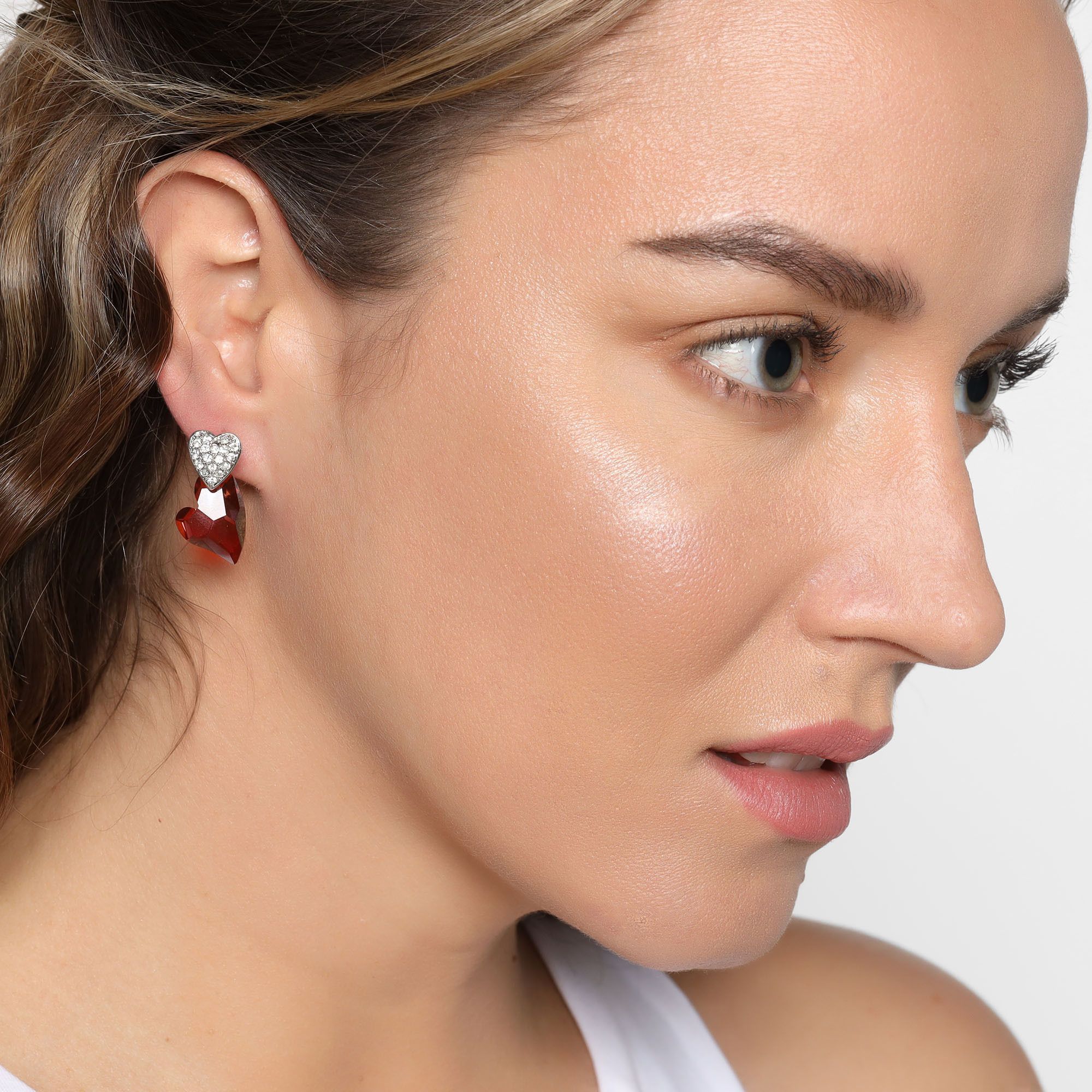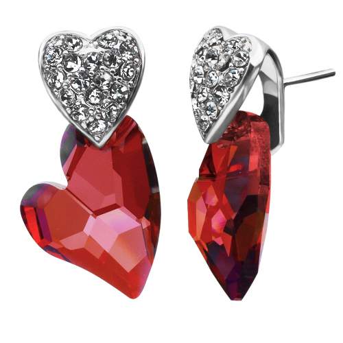 Hermosos aretes, en baño de oro blanco de 18 quilates, diseño de corazones, en cristal color rojo e incrustaciones de cristales blancos. Fabricado en una estructura de aleación de platino con rodio sin níquel