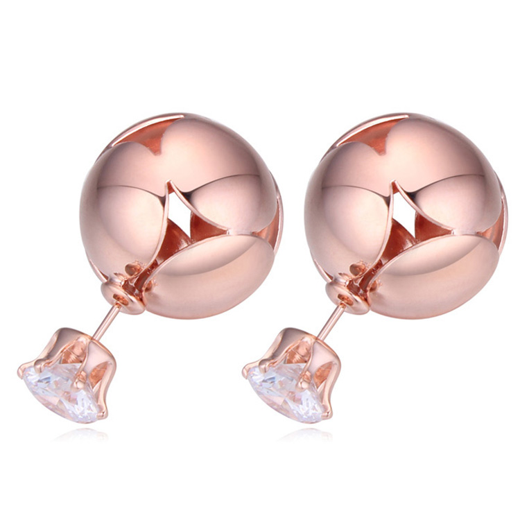 Lindos aretes, en baño de oro rosa de 18 quilates, diseño de esfera, con detalles en acabado brillante y cristal blanco corte brillante.