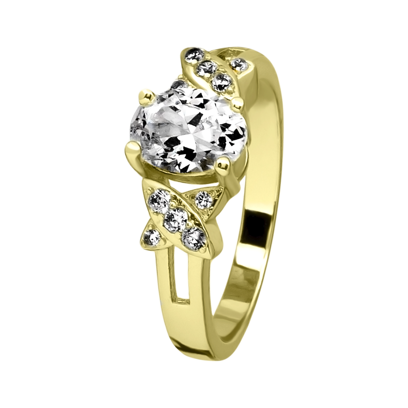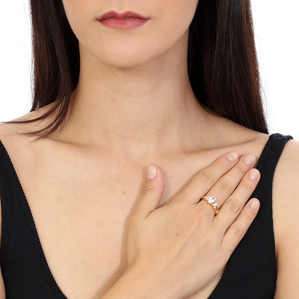 Anillo en baño de oro amarillo de 18 quilates, fino diseño, con cristal blanco corte brillante, detalles en dorado e incrustaciones de cristales en color blanco.