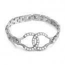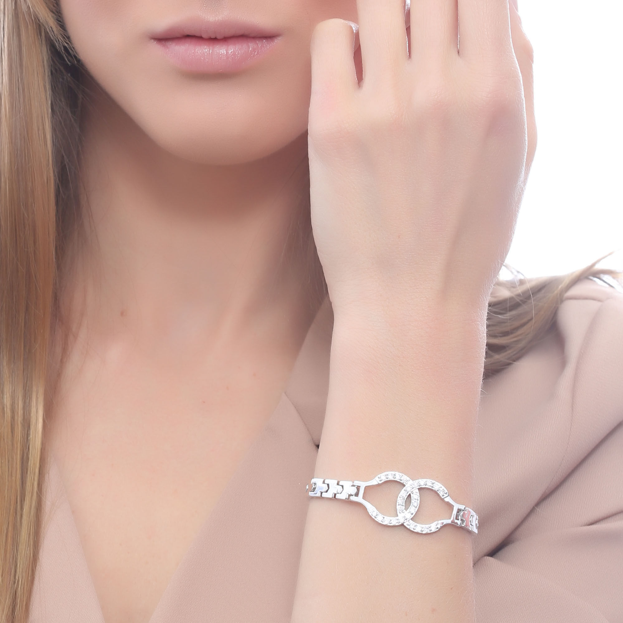 Brazalete en baño de oro blanco de 18 quilates, elegante diseño entrelazado, con incrustaciones de cristales en color blanco.