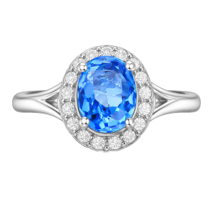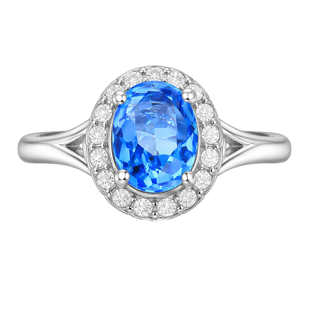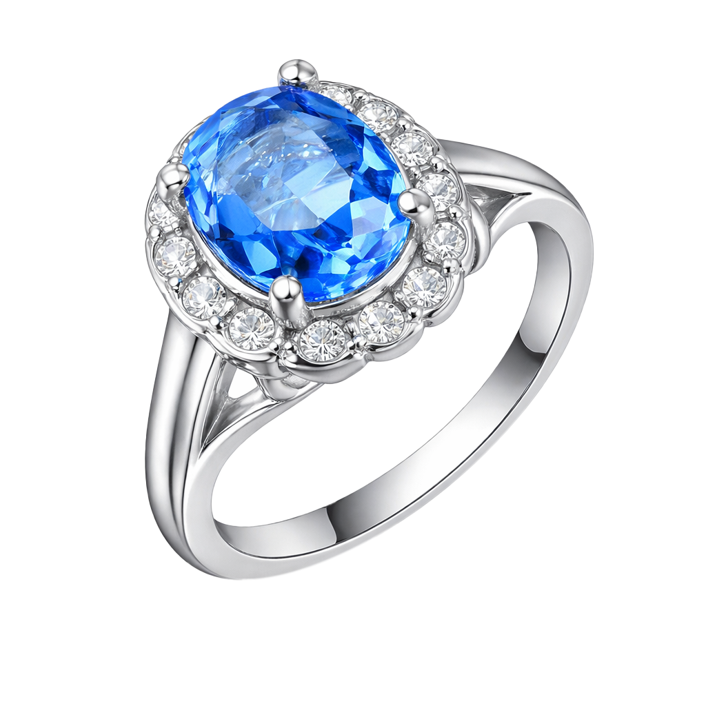 Fino anillo, en baño de oro blanco de 18 quilates, hermoso diseño, con cristal azul corte oval e incrustaciones de cristales blancos.