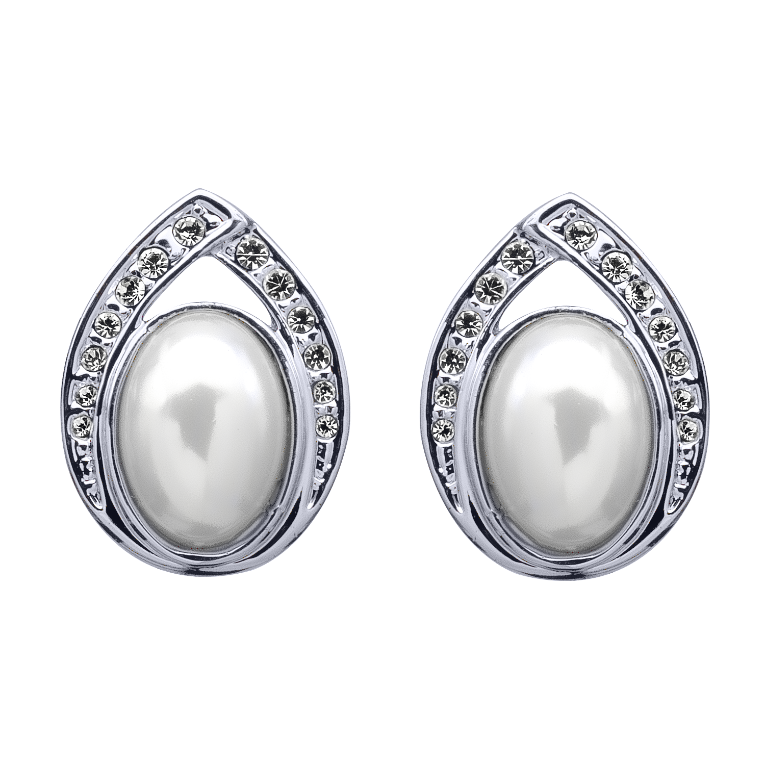 Finos aretes, en baño de oro blanco de 18 quilates, diseño de gota, con detalle de perla blanca e incrustaciones de cristales blancos.
