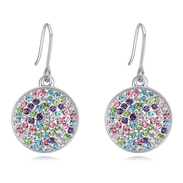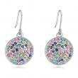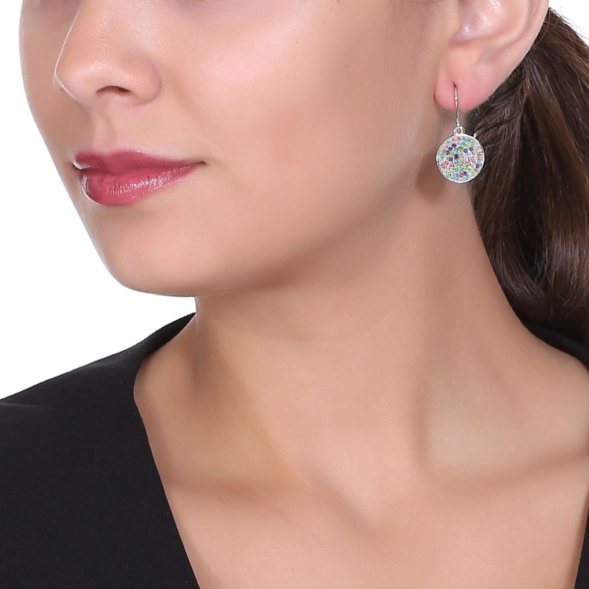 Hermosos aretes, en baño de oro blanco de 18 quilates, diseño de círculo, con incrustación de cristales en colores. Fabricado en una estructura de aleación de platino con rodio sin níquel
