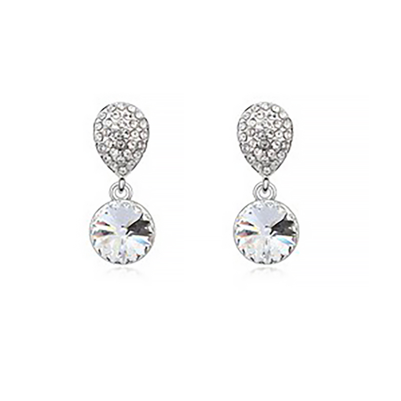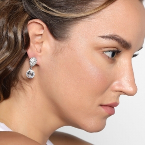 Preciosos aretes, en baño de oro blanco de 18 quilates, diseño de gota, con cristal blanco corte brillante e incrustación de cristales blancos.