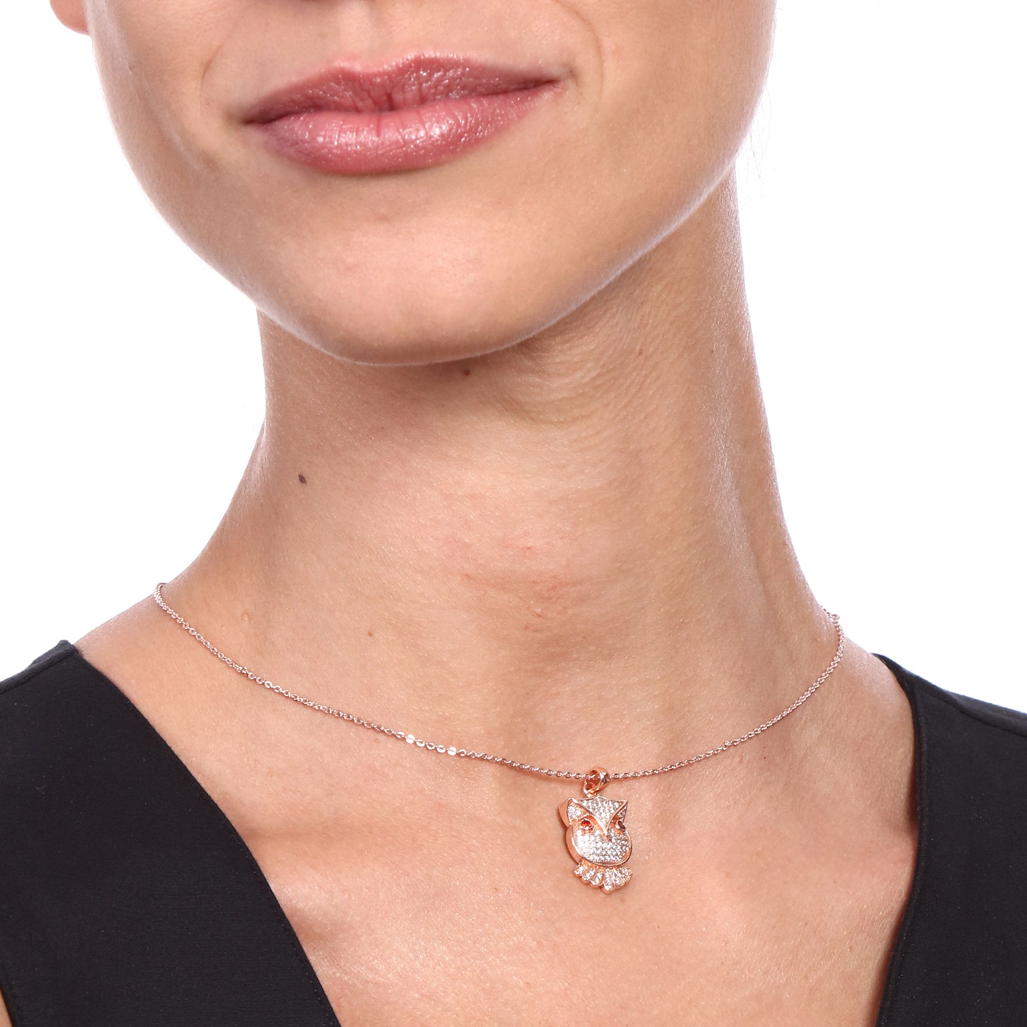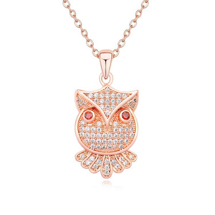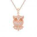 Hermoso Dije en baño de oro rosa de 18 quilates, diseño de búho con incrustación de cristales en color blanco. Fabricado en una estructura de aleación de platino con rodio sin níquel. 1. joyería Hipoalergénica. 3. Incluye cajita de joyería. 3. Garantía de 30 días por defectos de fabrica.