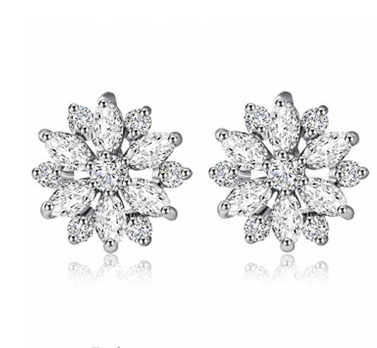 Lindos aretes, en baño de oro blanco de 18 quilates, diseño de flor, con incrustaciones de cristales en color blanco. Fabricado en una estructura de aleación de platino con rodio sin níquel