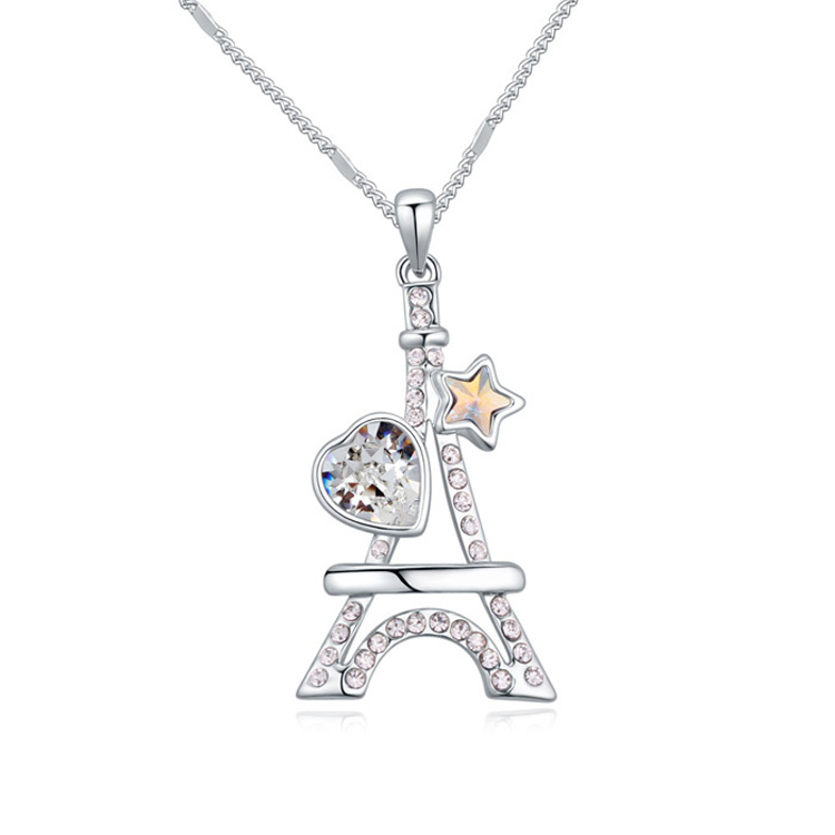 Lindo dije en baño de oro blanco de 18 quilates, diseño de torre eiffel con detalles de corazón y extrella con incrustaciones de cristales en color blanco y tornasol.