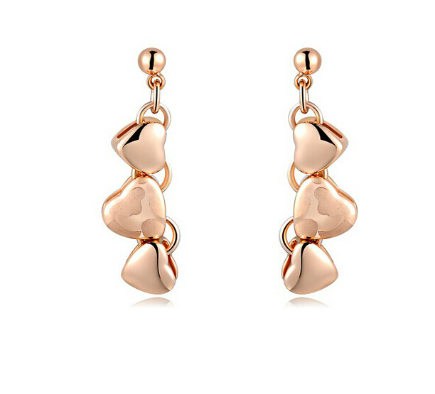 Lindos aretes, en baño de oro rosa de 18 quilates, diseño de corazones engarzados, con detalles esmerilados.