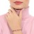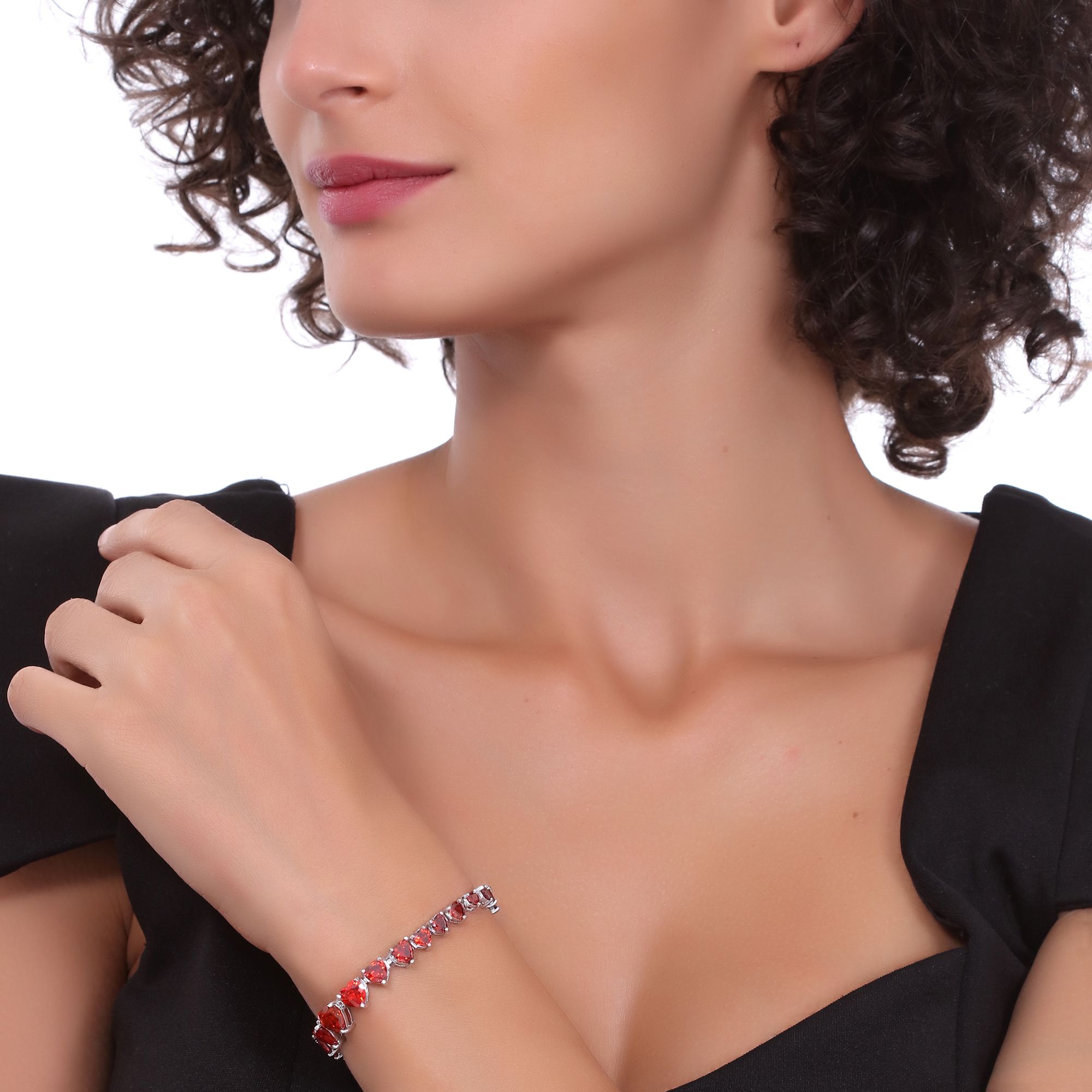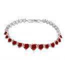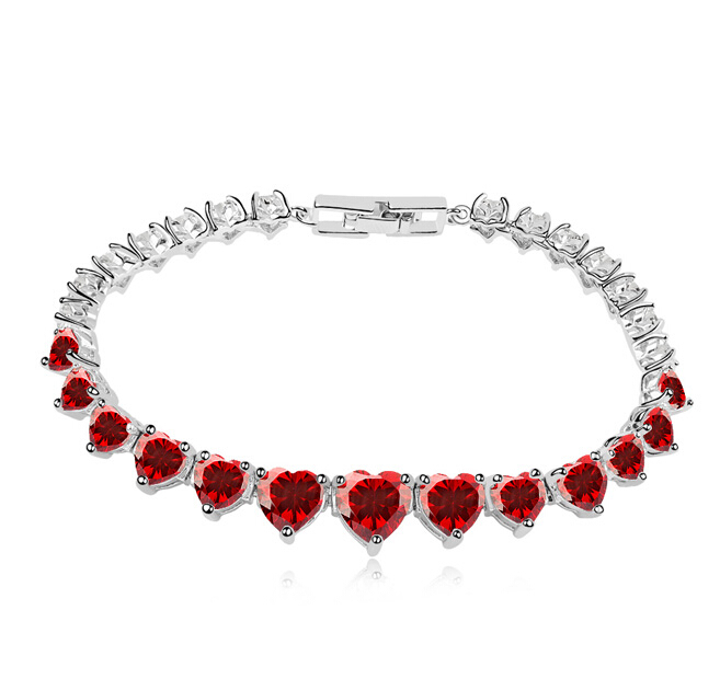 Elegante brazalete, en baño de oro blanco de 18 quilates, fino diseño de corazones en cristal rojo.