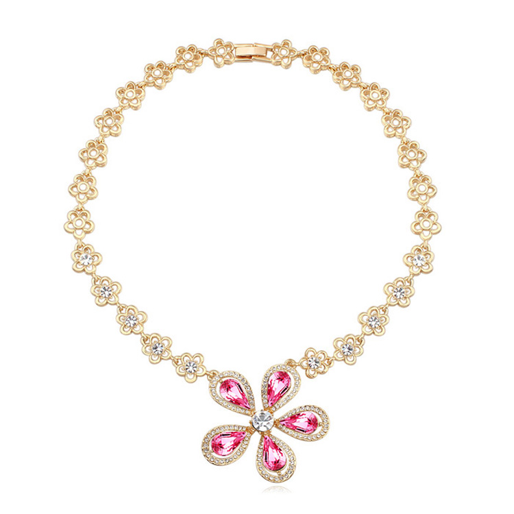 Precioso Collar en baño de oro amarillo de 18 quilates, diseño de flores con incrustación de cristales en color blanco y rosa.