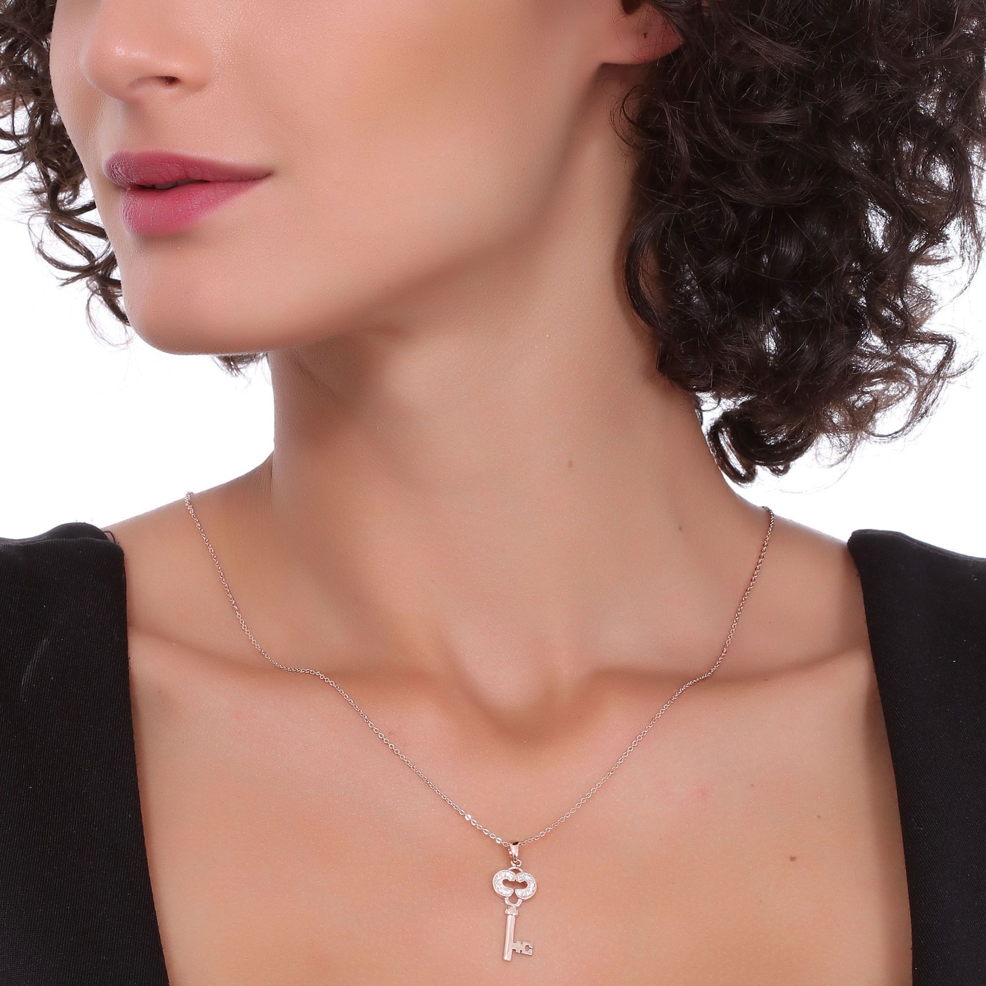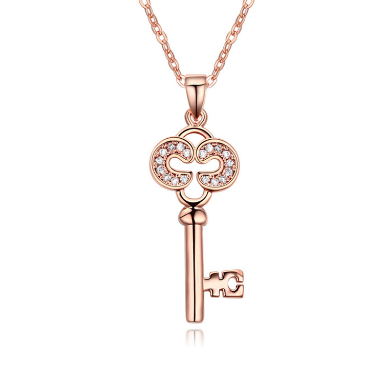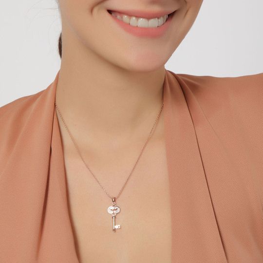 Lindo Dije en baño de oro rosa de 18 quilates, diseño de llave con incrustación de cristales en color blanco. Fabricado en una estructura de aleación de platino con rodio sin níquel 1. joyería Hipoalergénica. 2. Incluye cajita de joyería. 3. Garantía de 30 días por defectos de fabrica.