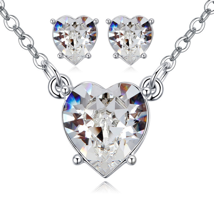 Juego de aretes y dije en baño de oro blanco de 18 quilates, diseño de corazón con incrustación de cristales en color blanco.