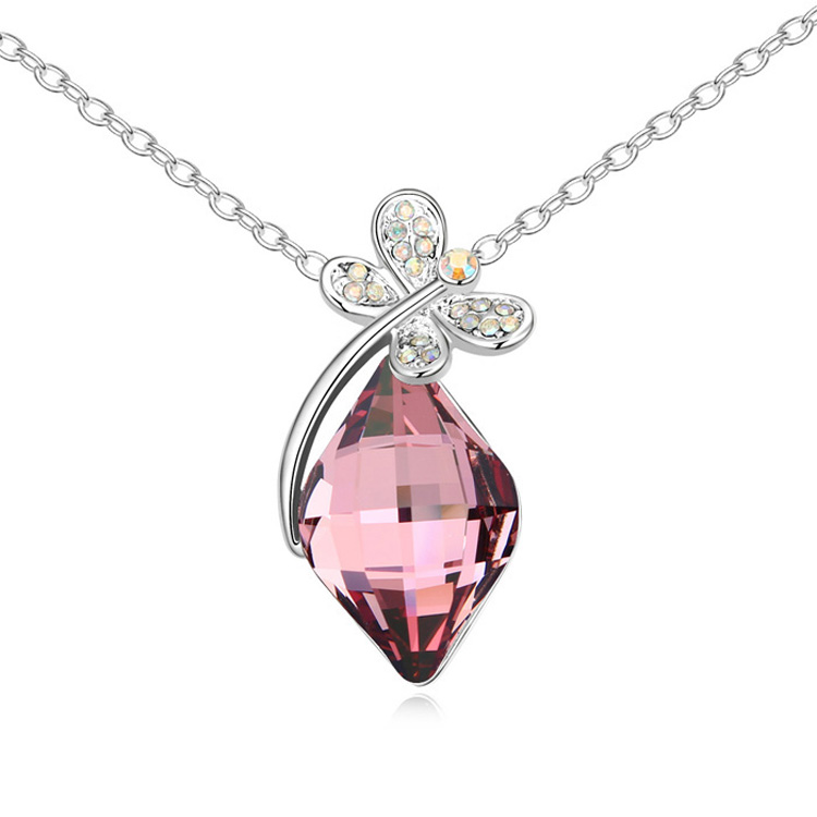 Dije en baño de oro blanco de 18 quilates, diseño de rombo con detalle de libelula e incrustación de cristales en color blanco y morado.