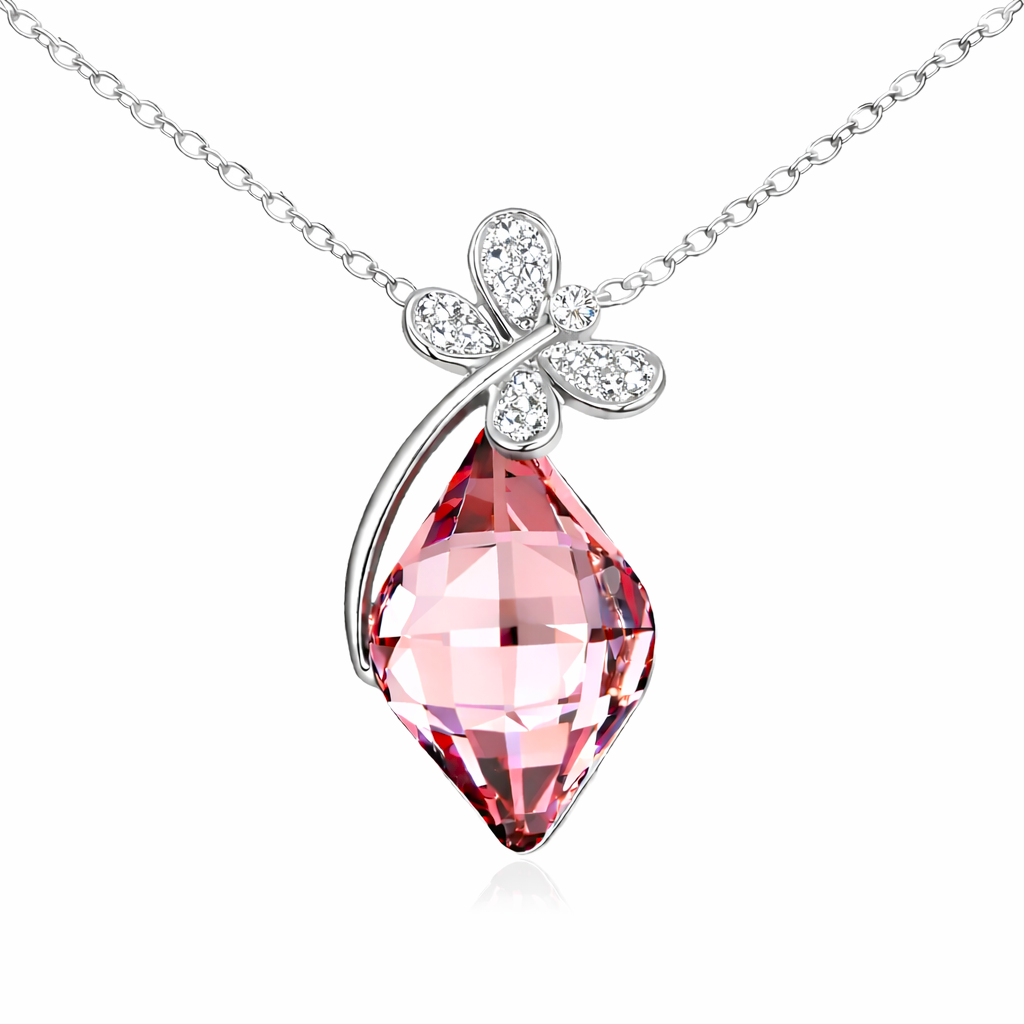 Dije en baño de oro blanco de 18 quilates, diseño de rombo con detalle de libelula e incrustación de cristales en color blanco y morado.