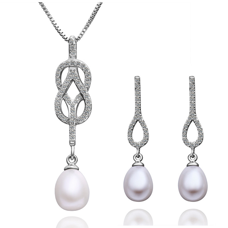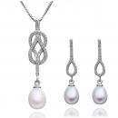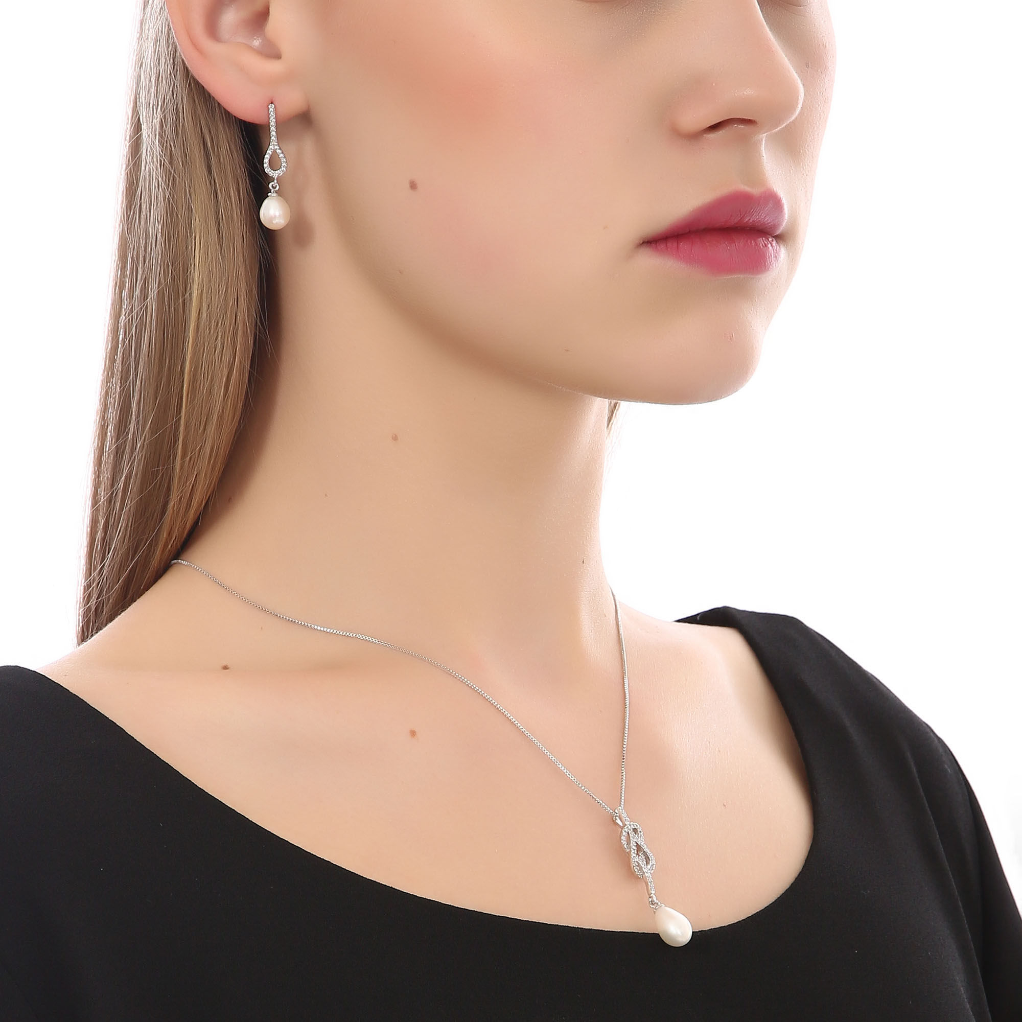 Juego de aretes y dije en baño de oro blanco de 18 quilates, diseño de nudo con detalle de perla. incrustación de cristales en color blanco.