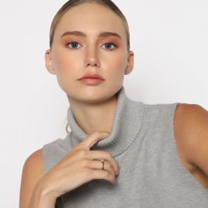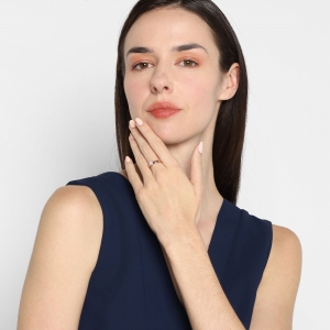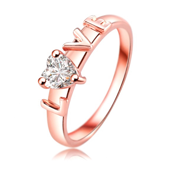 Hermoso anillo, en baño de oro rosa de 18 quilates, fino diseño con palabra "Love" en relieve e incrustación de cristal de en color blanco.