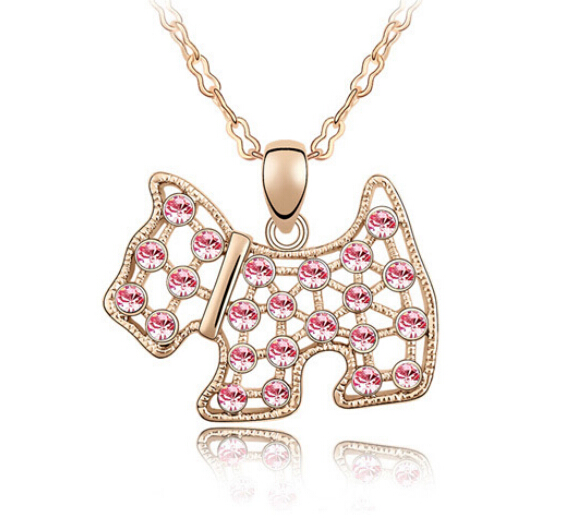 Tierno Dije en baño de oro rosa de 18 quilates, diseño de perrito con incrustación de cristales en color blanco y rosa. ElCollar tiene una cadena de 40 cm con extención de 5 cm. Fabricado en una estructura de aleación de platino con rodio sin níquel 1. joyería Hipoalergénica. 2. Incluye cajita de joyería. 3. Garantía de 30 días por defectos de fabrica.