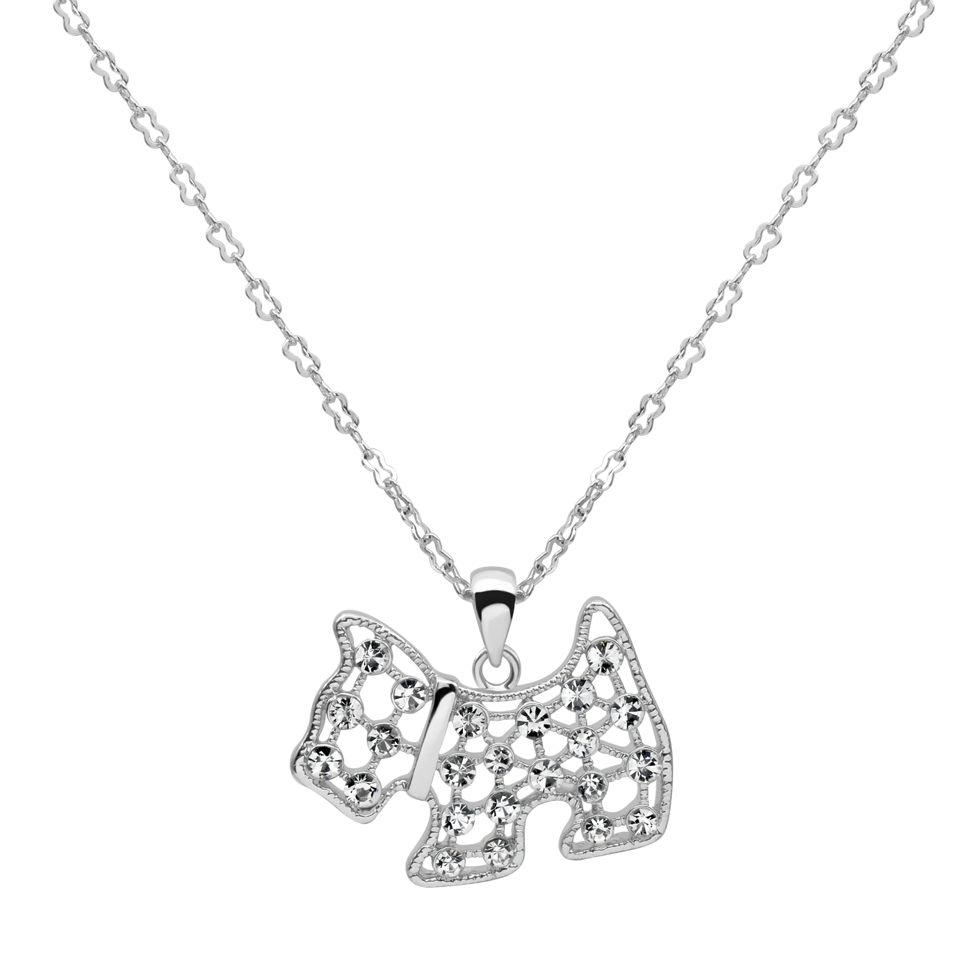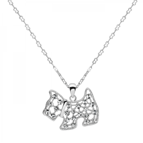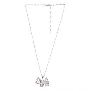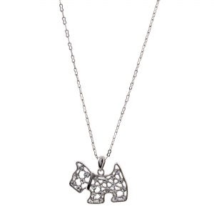 Tierno dije en baño de oro blanco de 18 quilates, diseño de perrito con incrustaciones de cristales en color blanco.