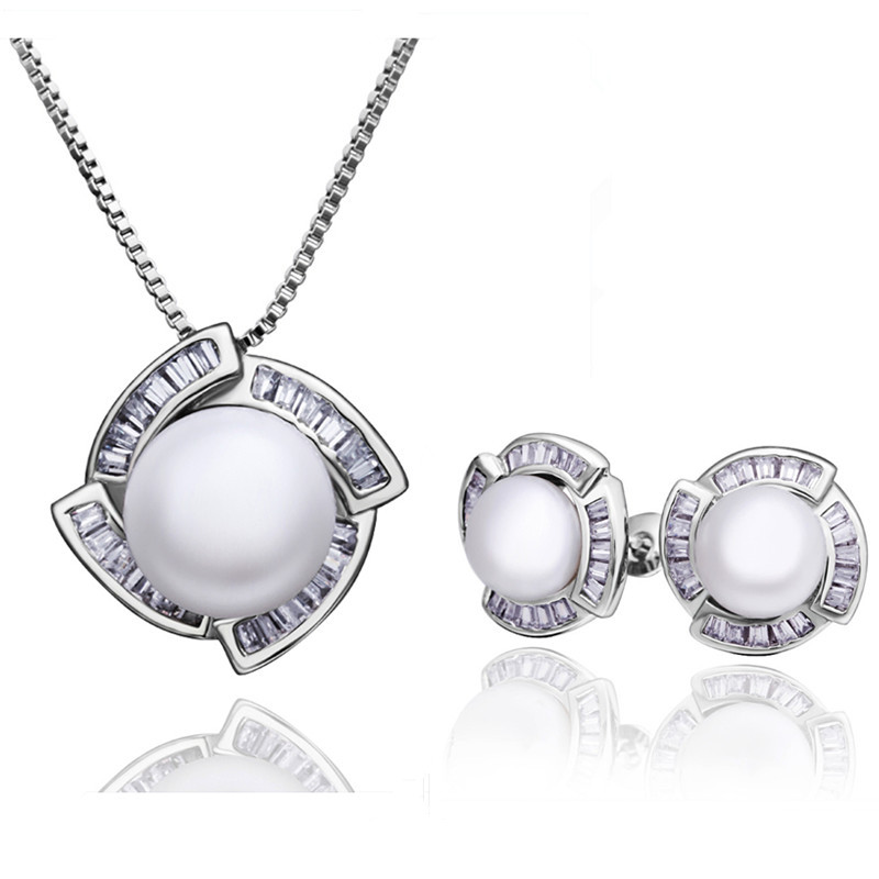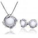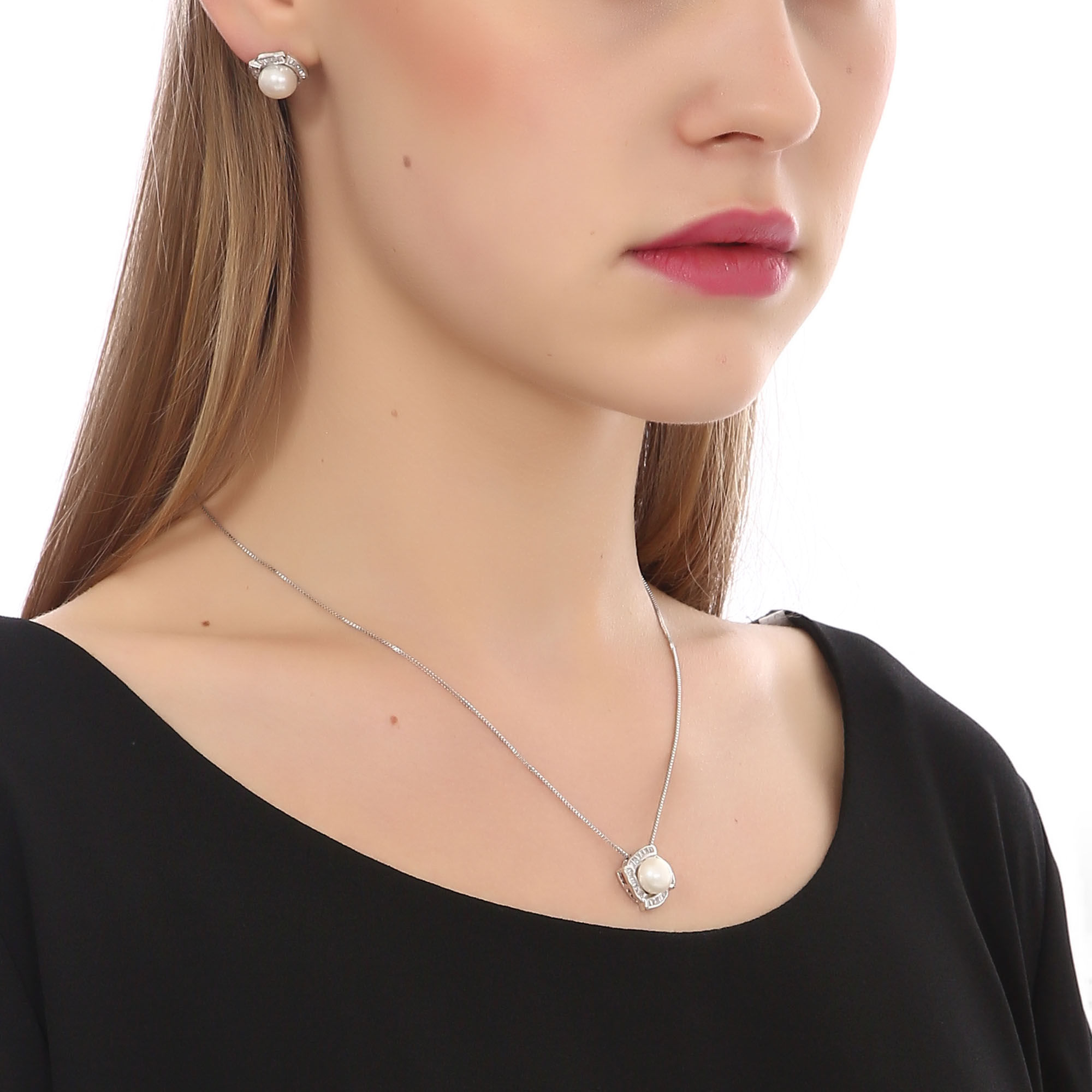 Juego de aretes y dije en baño de oro blanco de 18 quilates, diseño de rombo con detalle de perla. incrustación de cristales en color blanco.