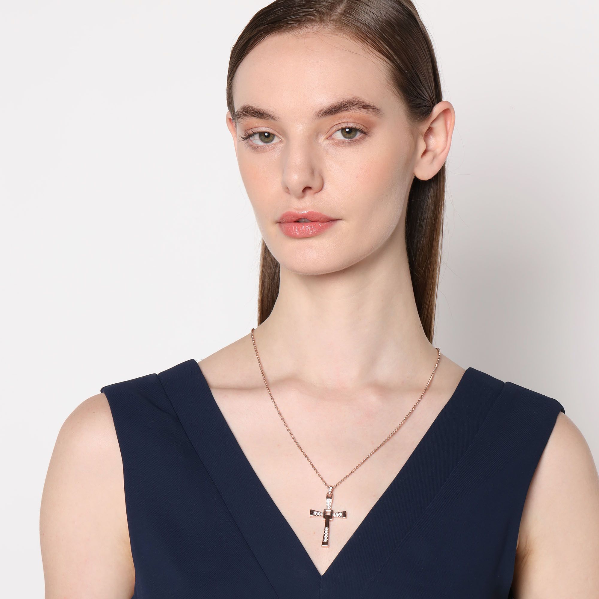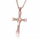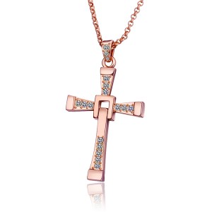 Hermoso Dije en baño de oro rosa de 18 quilates, diseño de cruz con incrustación de cristales en blanco. Fabricado en una estructura de aleación de platino con rodio sin níquel. 1. joyería Hipoalergénica. 2. Incluye cajita de joyería. 3. Garantía de 30 días por defectos de fabrica.