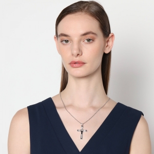 Hermoso Dije en baño de oro blanco de 18 quilates, diseño de cruz con incrustación de cristales en blanco. Fabricado en una estructura de aleación de platino con rodio sin níquel. 1. joyería Hipoalergénica. 2. Incluye cajita de joyería. 3. Garantía de 30 días por defectos de fabrica.