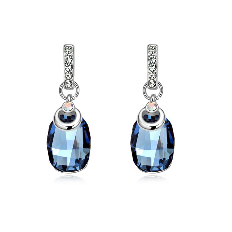 Hermoso aretes, en baño de oro blanco de 18 quilates, exquisito diseño, con cristal azul corte cushion, detalles en plateado e incrustación de cristales blancos. Fabricado en una estructura de aleación de platino con rodio sin níquel.